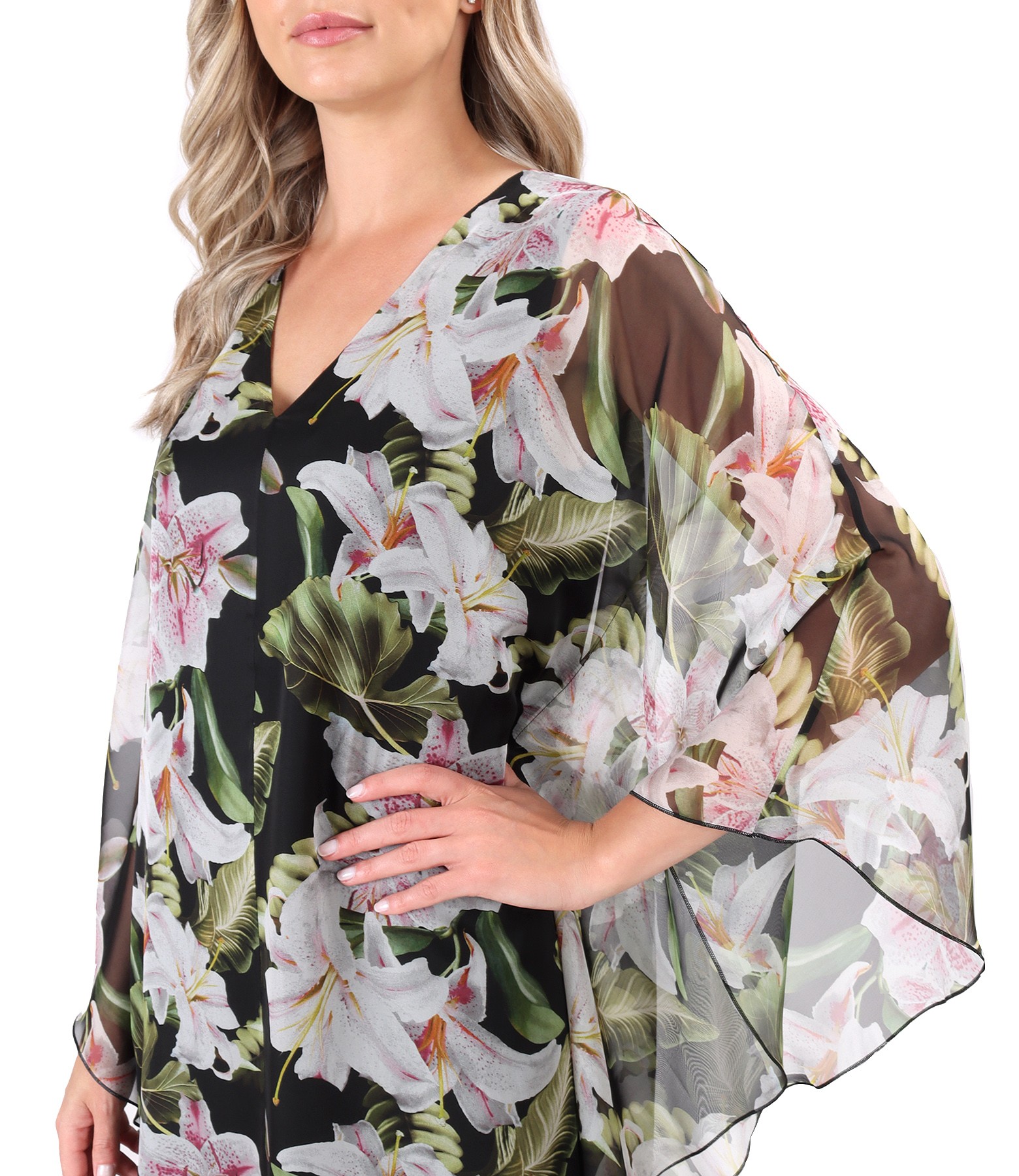 Rochie fluture din voal imprimata cu motive florale, dublata cu viscoza si cu decolteu in V.