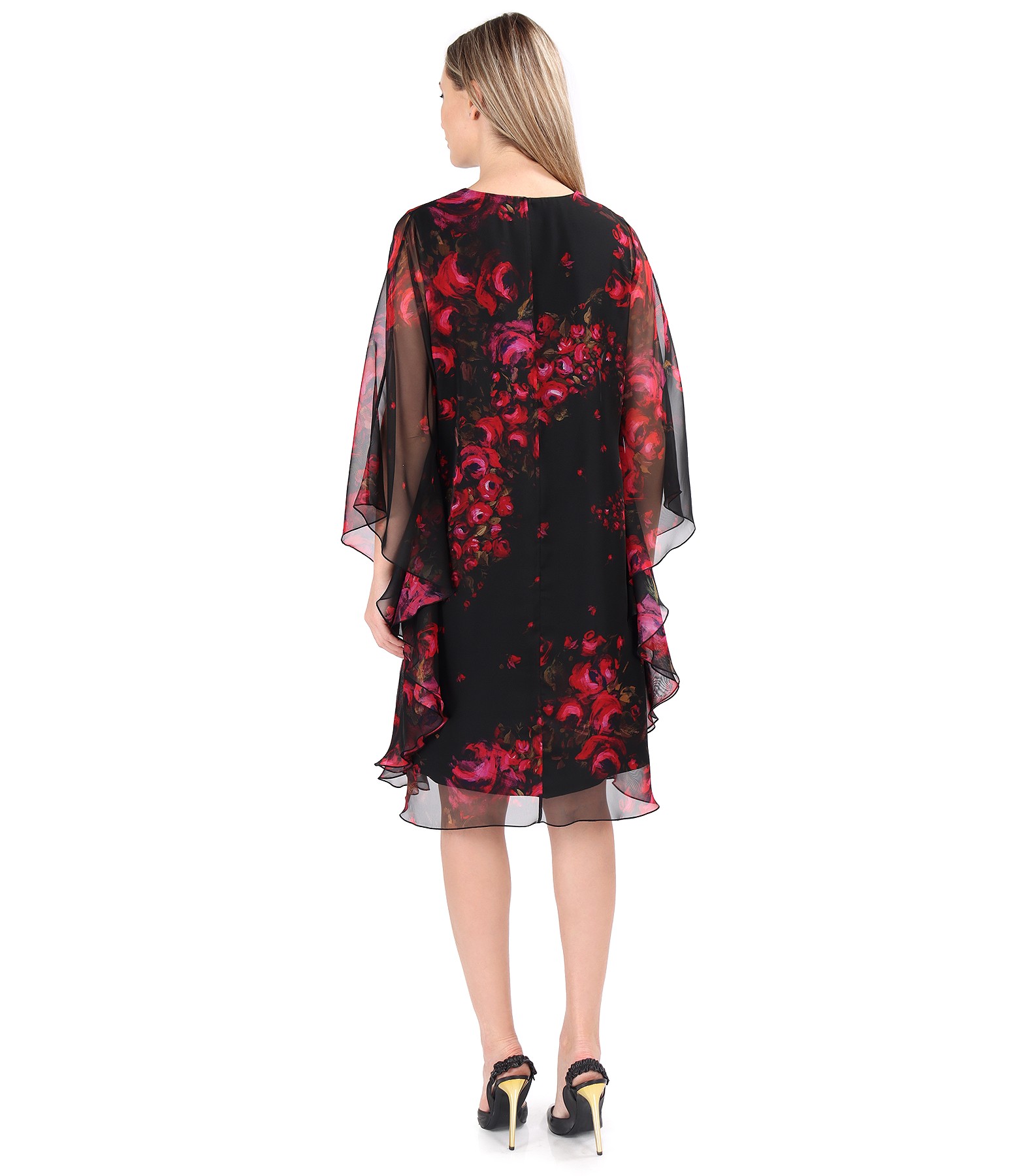 Rochie fluture din voal imprimata digital cu motive florale, dublata cu viscoza si cu decolteu in V.