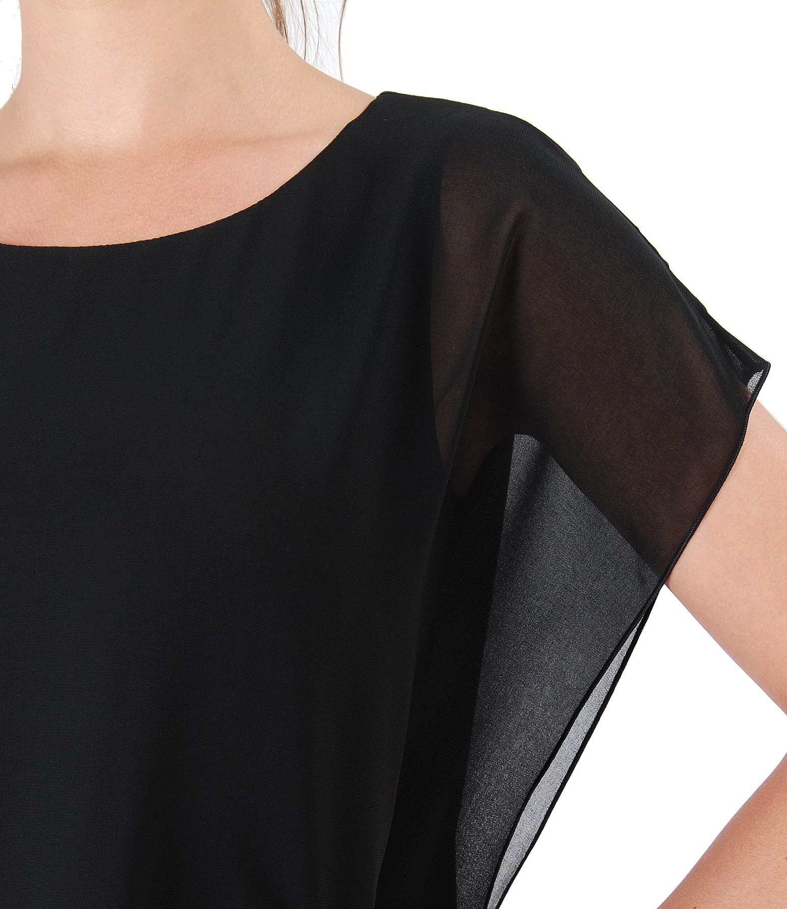 Rochie fluture din voal, captusita, fara maneci si cu decolteu rotund. Nu are sistem de inchidere.