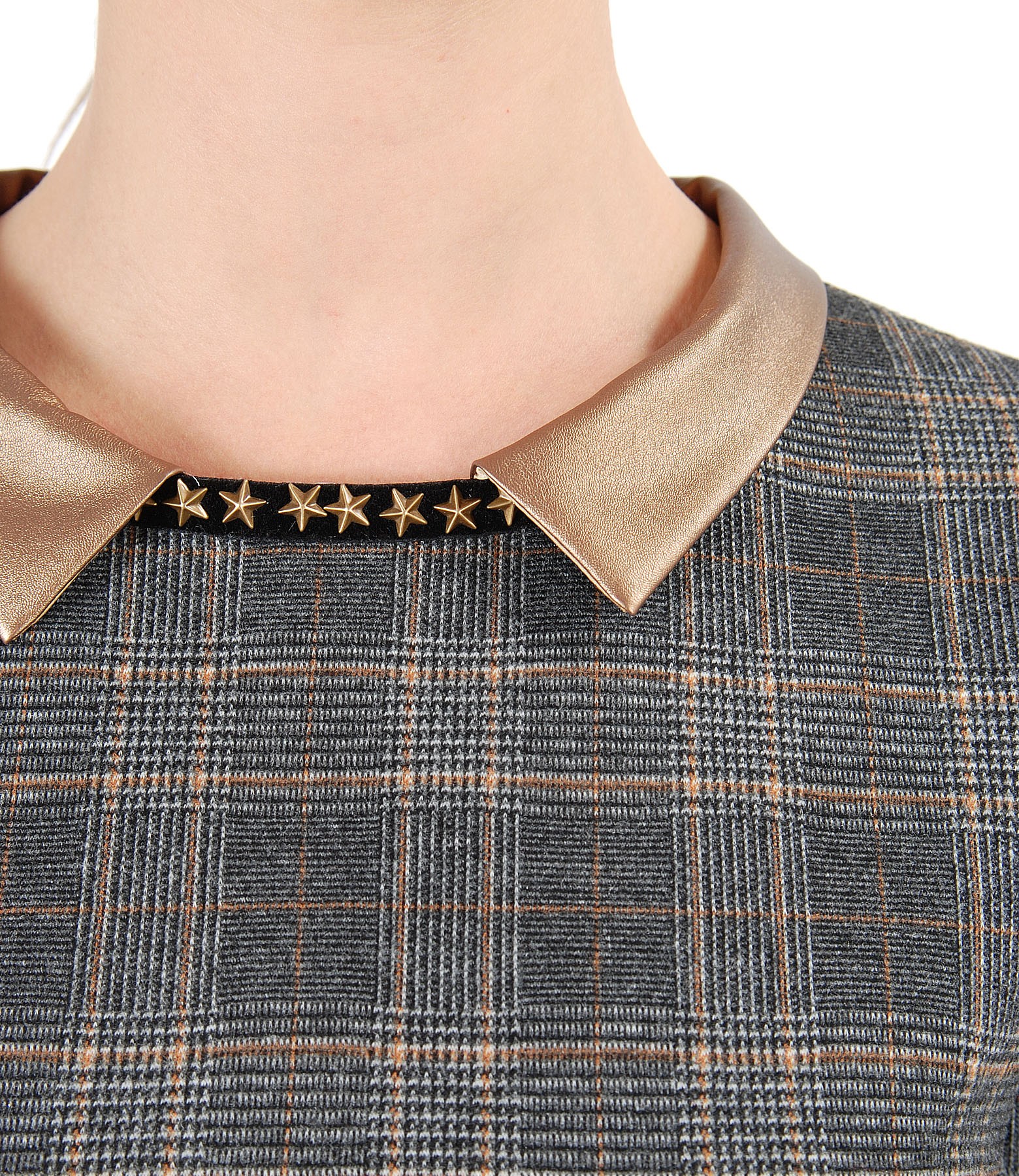 Rochie in carouri din stofa groasa elastica, necaptusita, cu guleras din piele, banda din catifea cu stelute la decolteu si maneci 3/4. Se inchide cu fermoar ascuns pe mijloc spate.