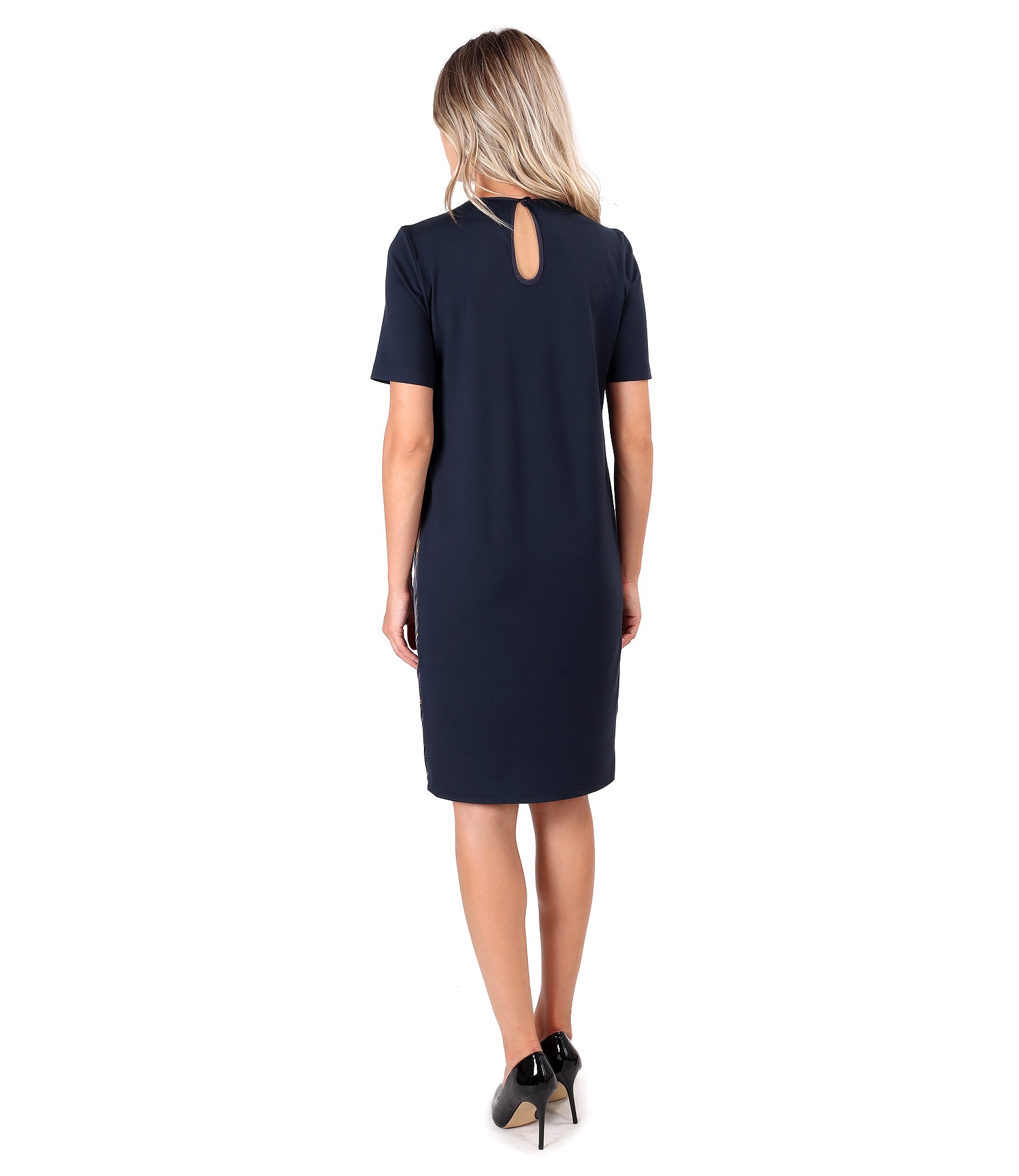 Rochie lejera cu fata din saten imprimat, dublata pe fata cu viscoza, cu maneci si spate din jerse elastic. Se inchide cu un nasture pe spate.