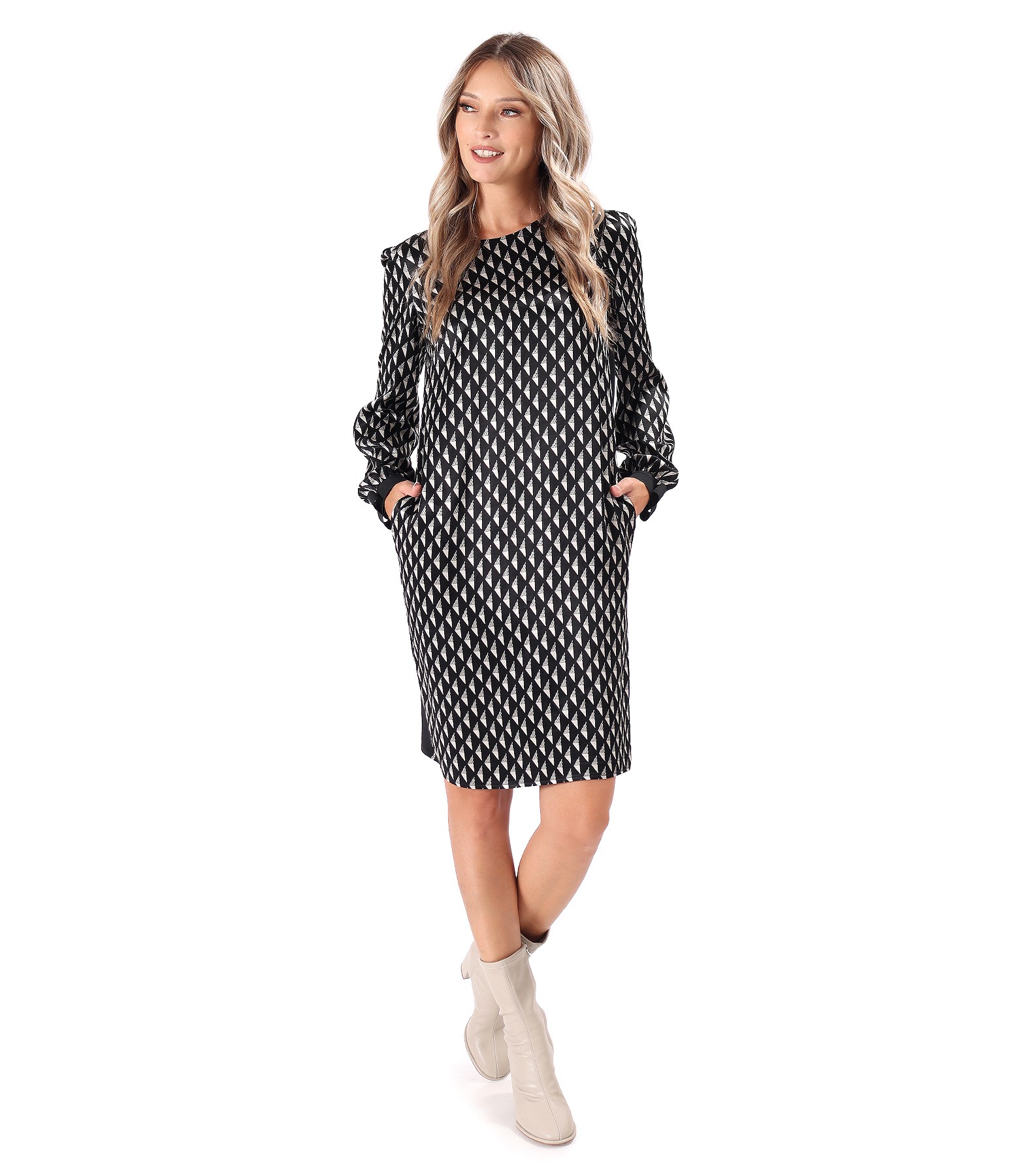 Rochie lejera cu fata si cu manecile din satin de viscoza imprimata cu motive geometrice, si cu spate din jerse elastic. Are maneci lungi incretite la terminatie si cu funda din banda elastica. Se inchide cu un nasture pe mijloc spate.