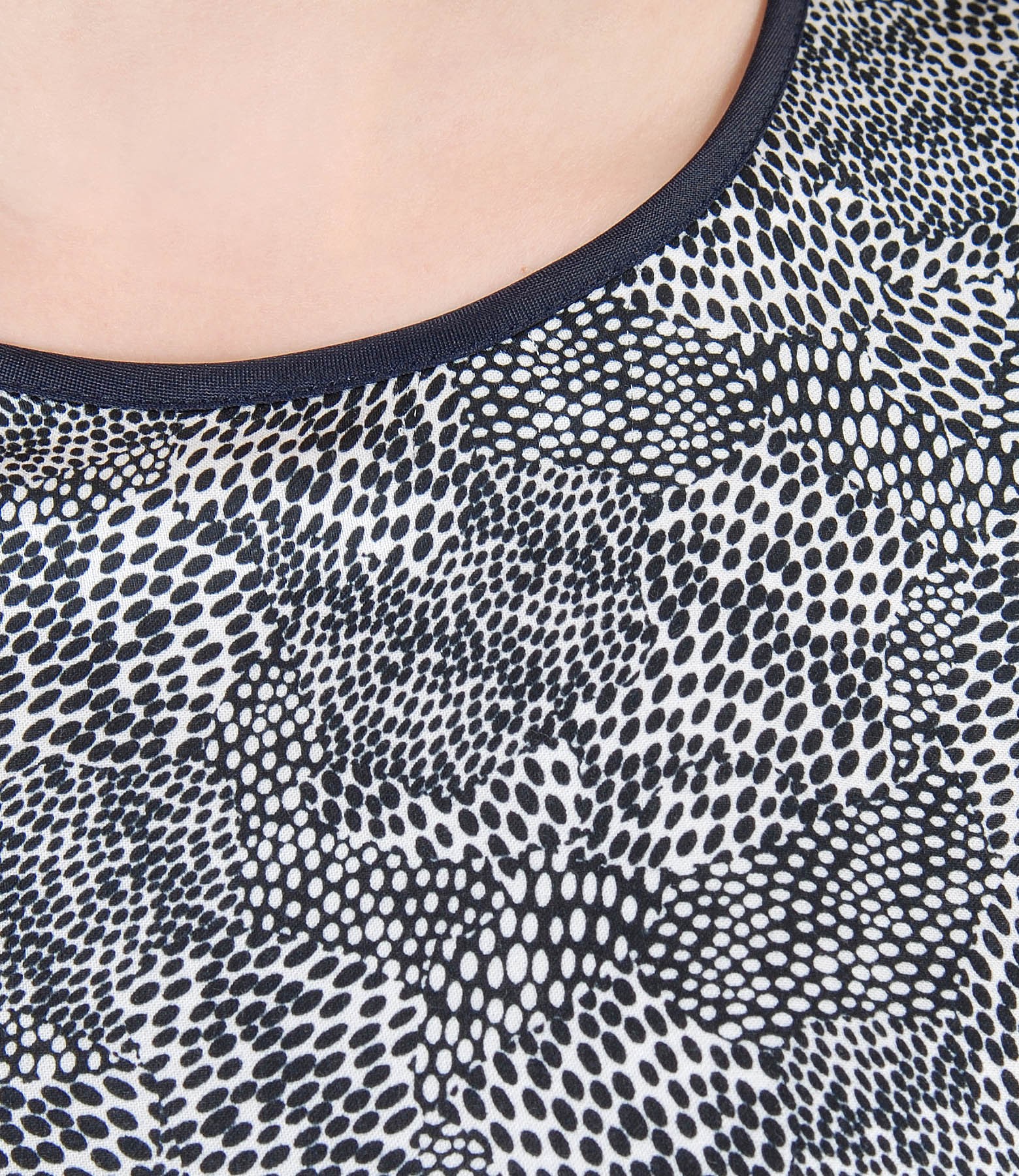 Rochie lejera, cu fata din viscoza imprimata alb-negru, cu maneci scurte si deolteu rotund. Nu are sistem de inchidere.