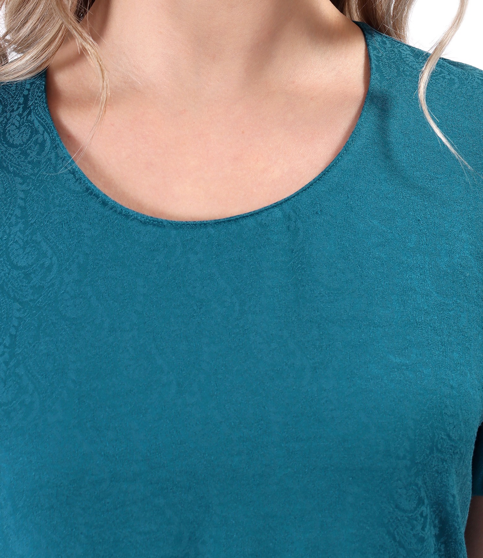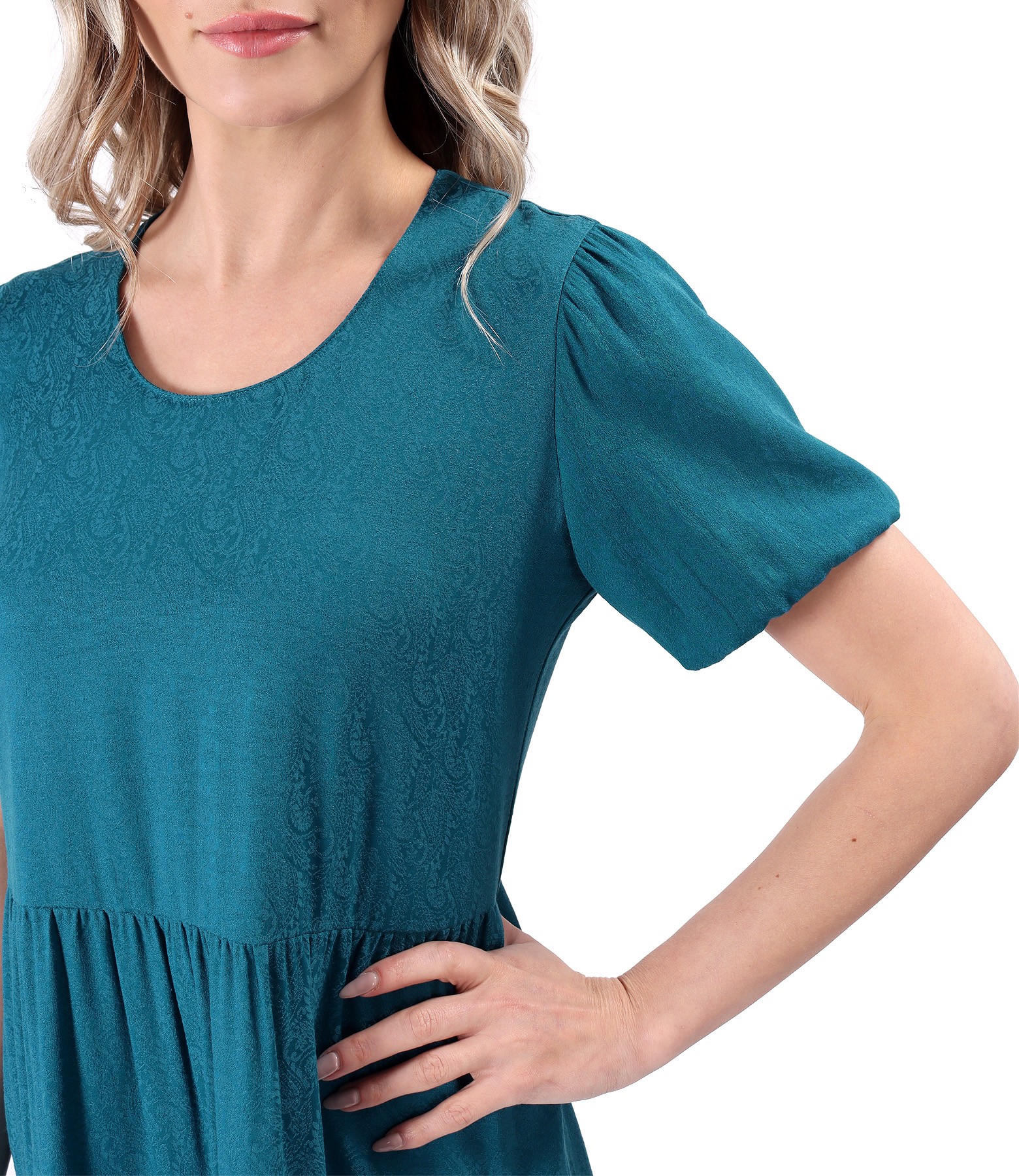 Rochie lejera cu volane din viscoza cu motive paisley tesute ton in ton, cu decolteu rotund si maneci scurte dublate cu viscoza.