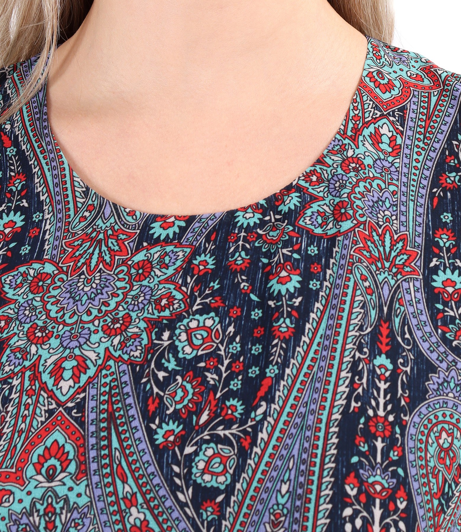 Rochie lejera cu volane din voal imprimat cu lire, dublata cu viscoza, cu maneci 3/4 si decolteu rotund. Nu are sistem de inchidere.