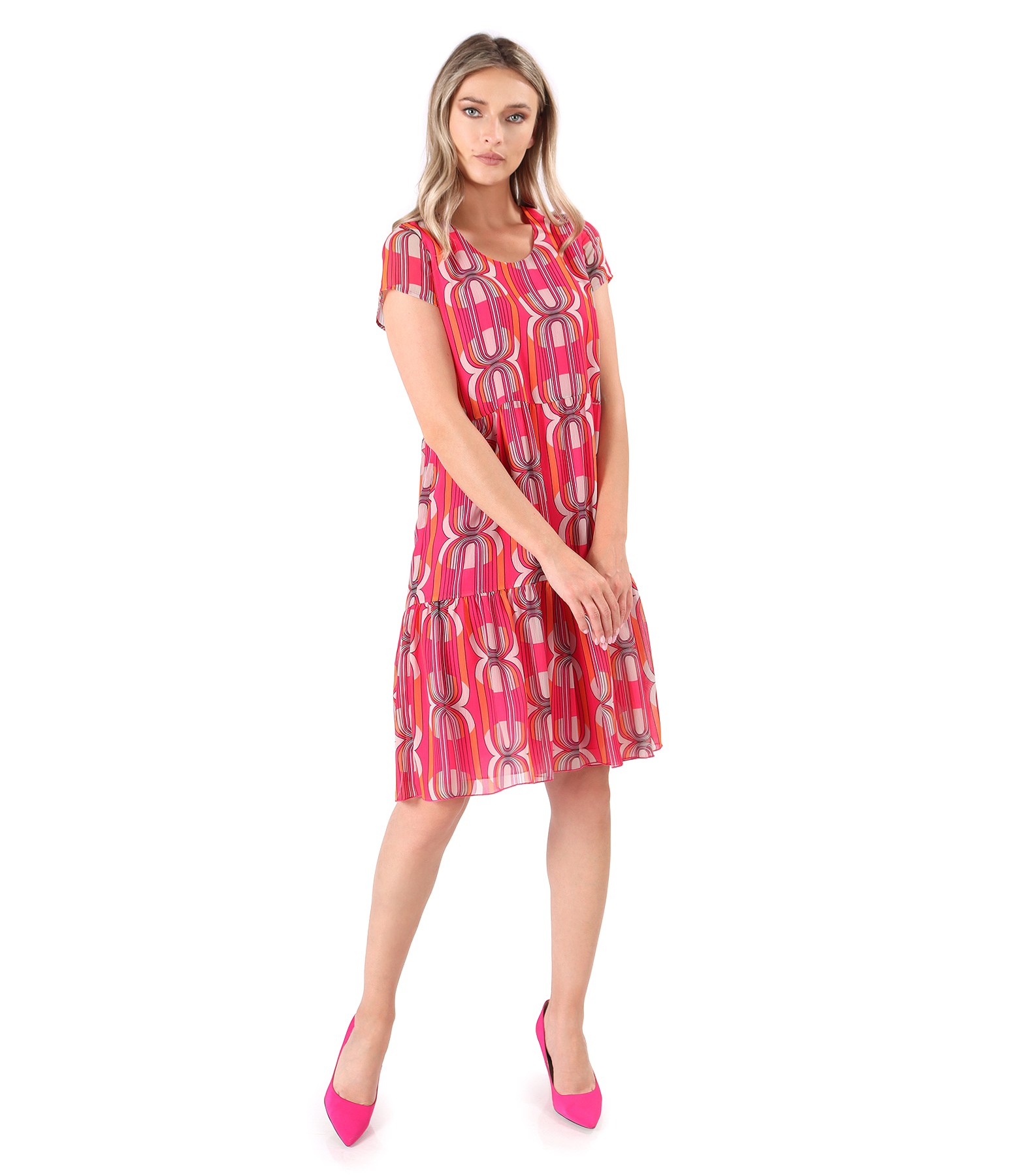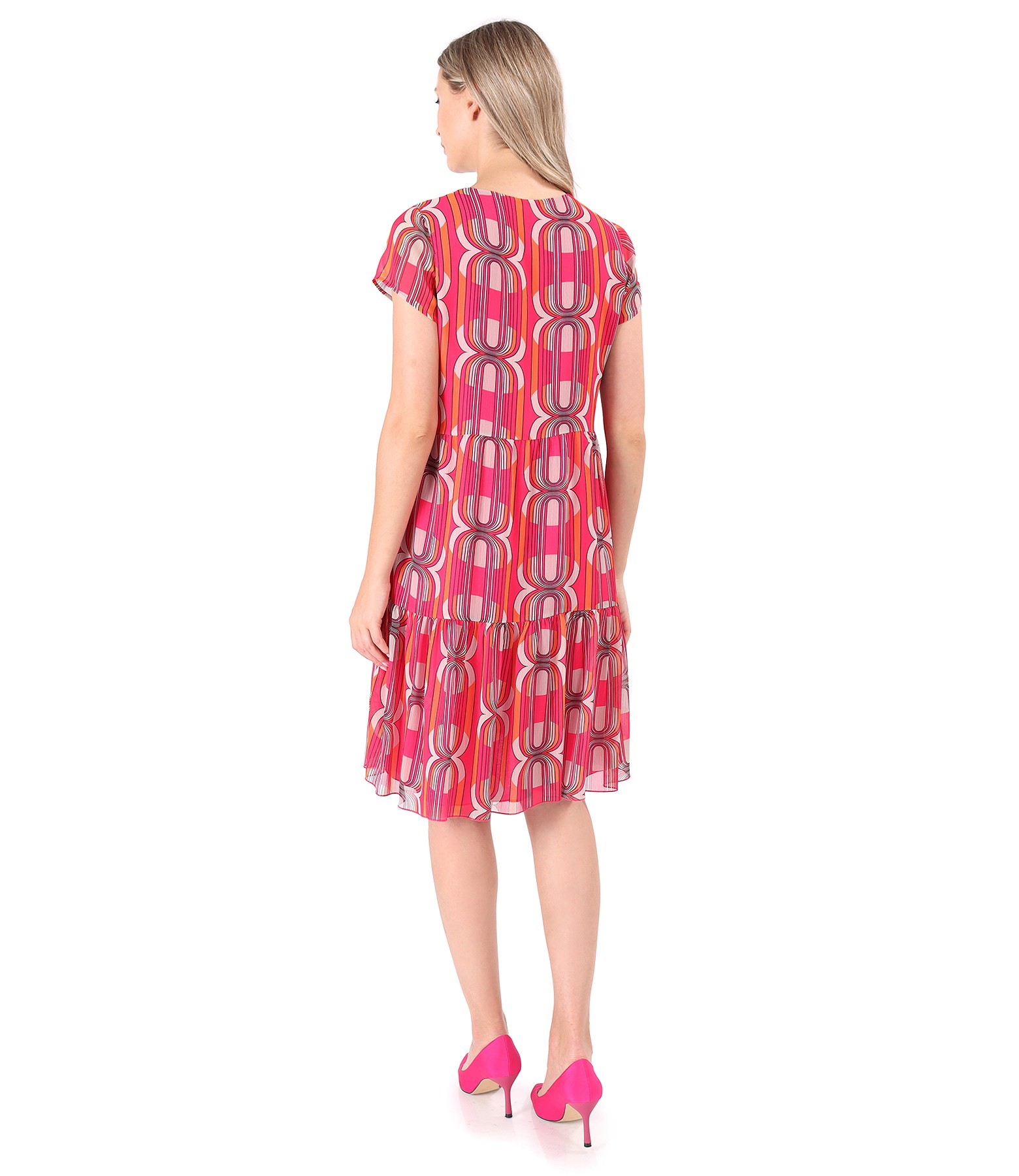 Rochie lejera cu volane din voal imprimat cu motve geometrice, dublata cu viscoza, cu maneci scurte si decolteu rotund. Nu are sistem de inchidere.