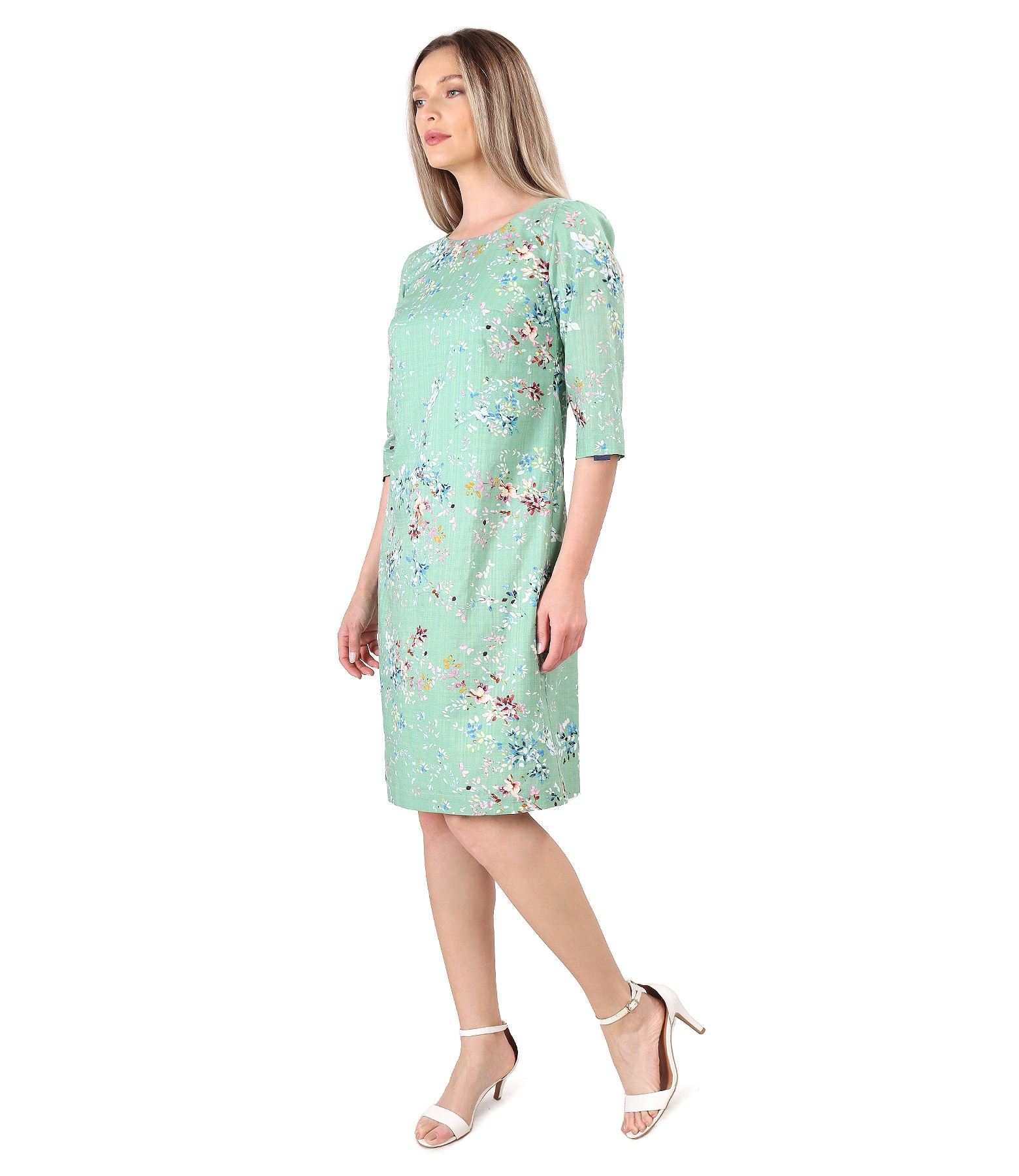 Rochie lejera din bumbac cu viscoza imprimata cu motive florale, dublata cu viscoza, cu maneci 3/4 si decolteu rotund. Se inchide cu fermoar ascuns pe mijloc spate.