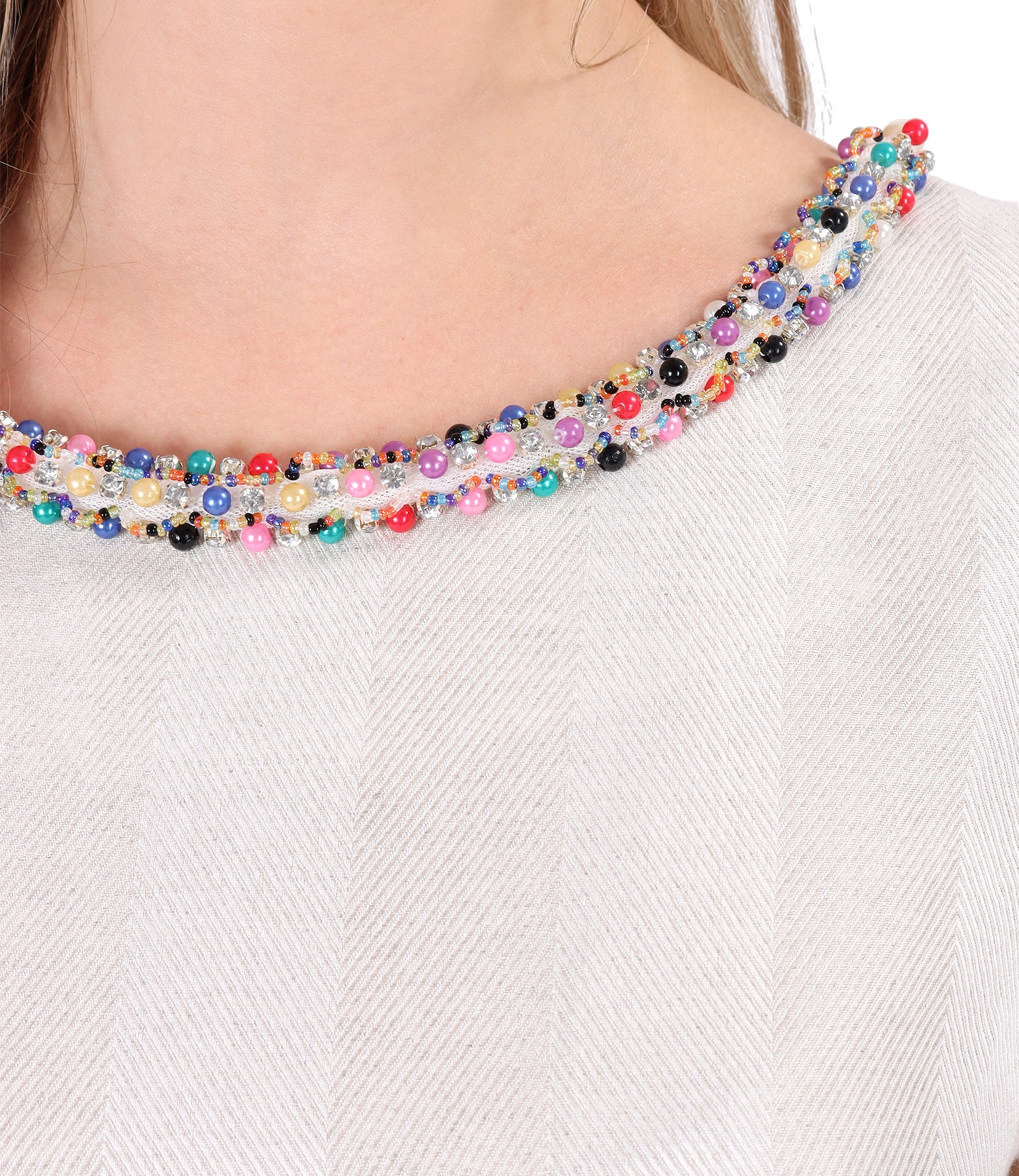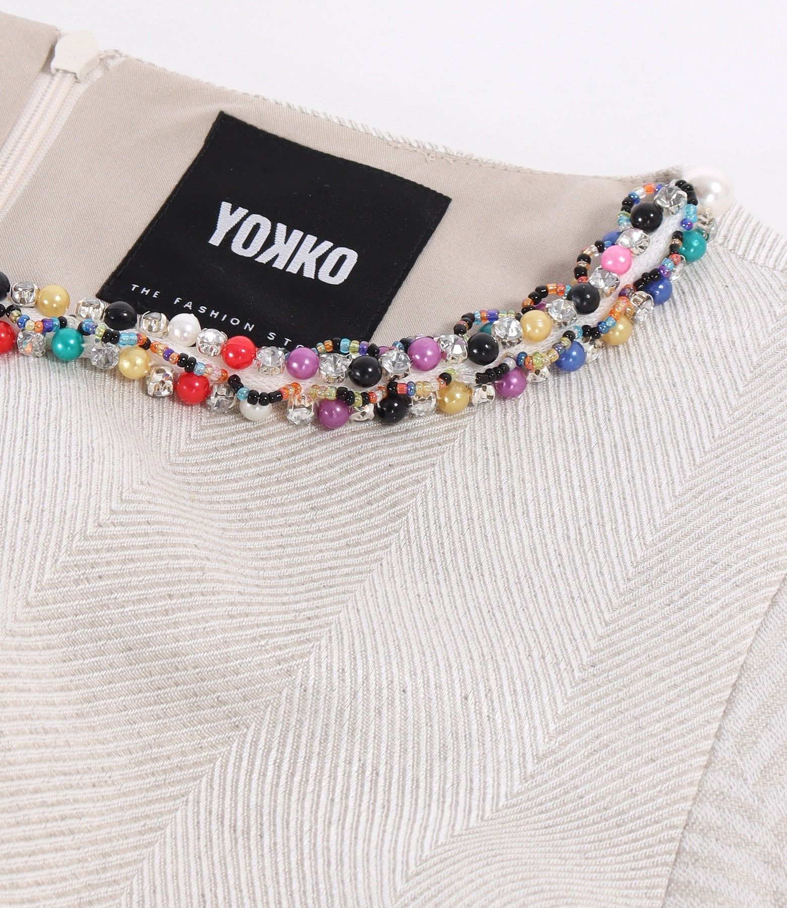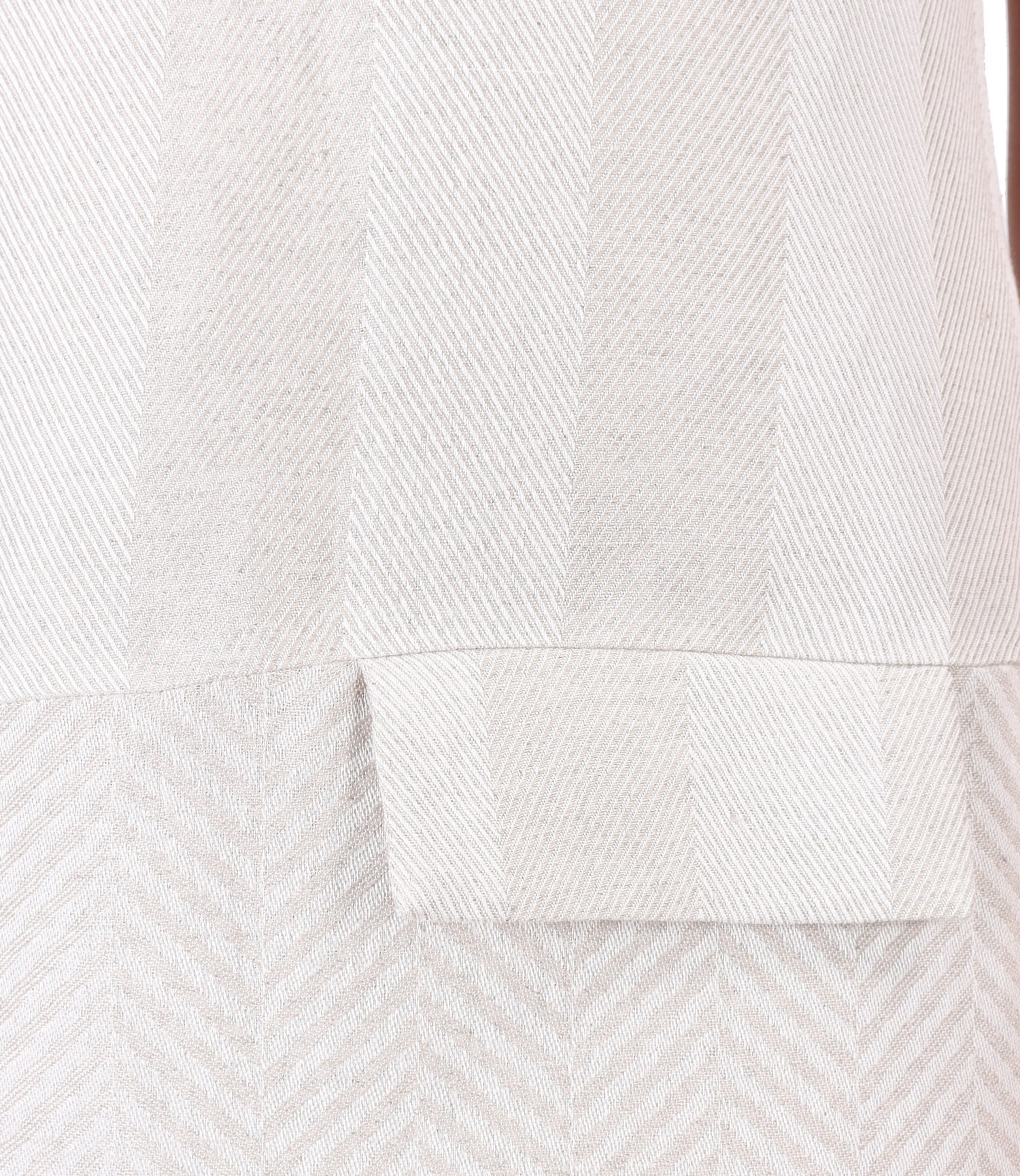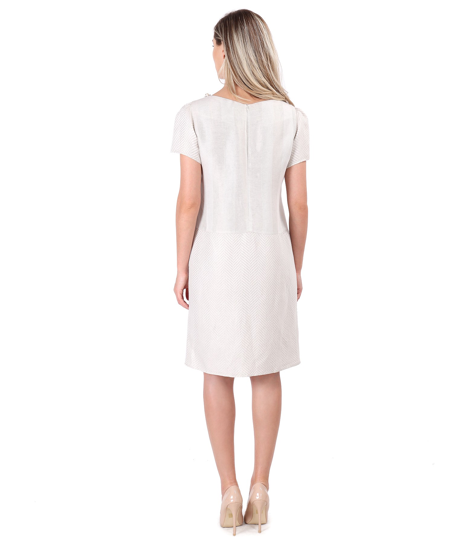 Rochie dreapta din in si viscoza, necaptusita, cu maneci scurte si clape decorative in dreptul taliei. Cu decolteu rotund accesorizat cu pasmanterie colorata. Se inchide cu fermoar ascuns pe mijloc spate.