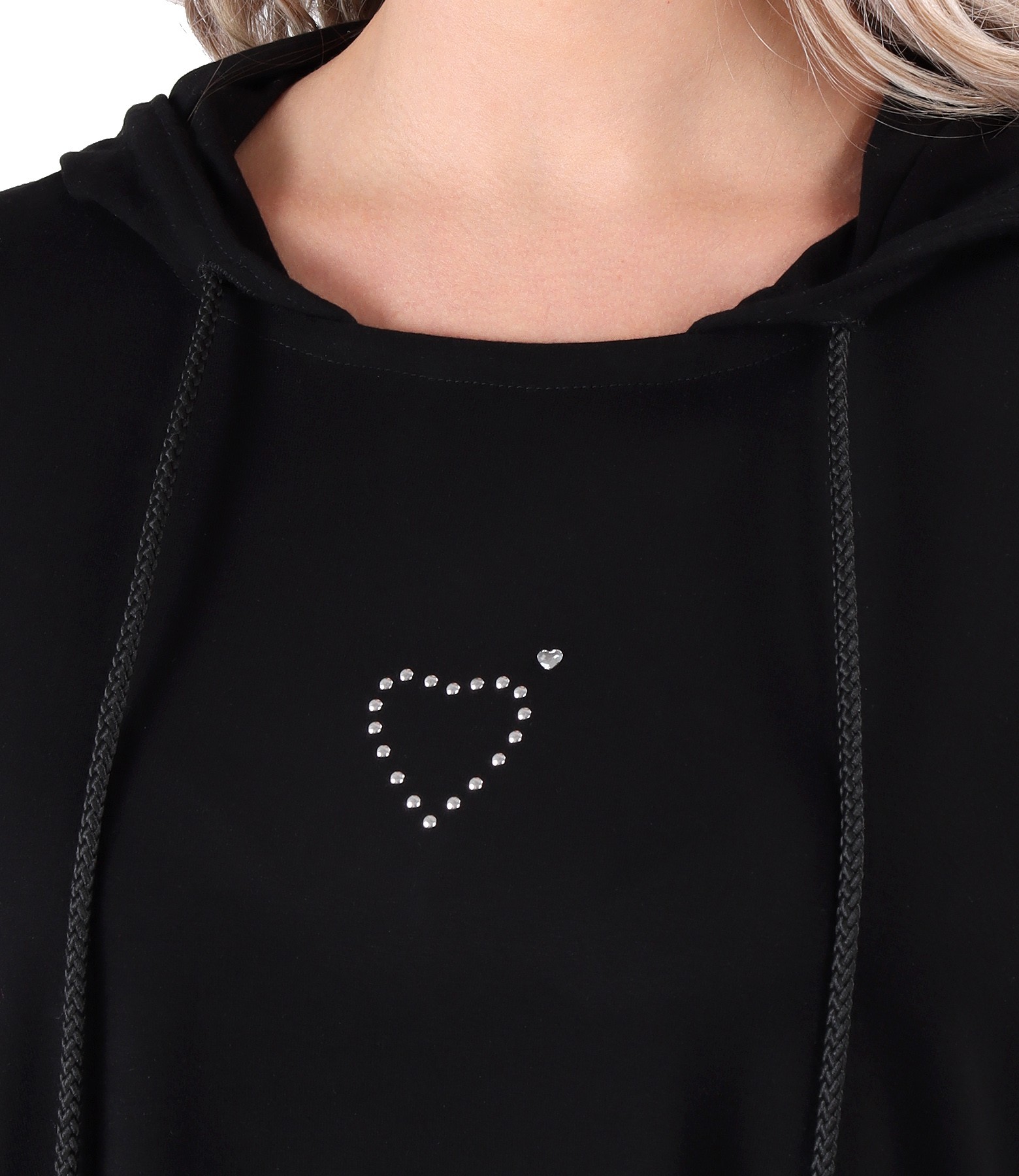 Rochie lejera din jerse elastic fin, necaptusita, cu gluga cu sireturi, cu maneci scurte si aplicatie decorativa in forma de inima pe fata.