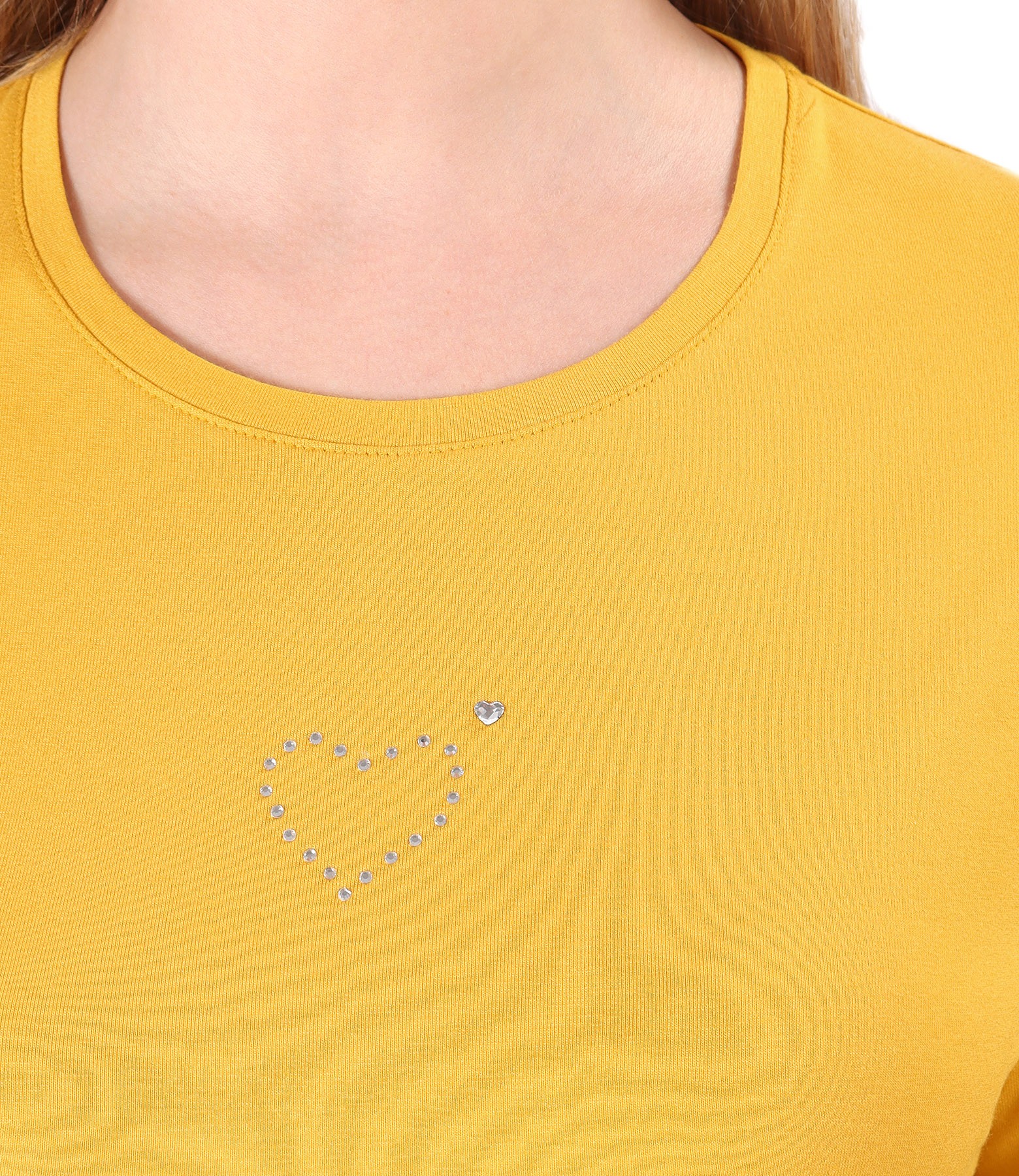 Rochie lejera din jerse elastic fin, necaptusita, cu decolteu rotund, maneci scurte si aplicatie decorativa in forma de inima pe fata.