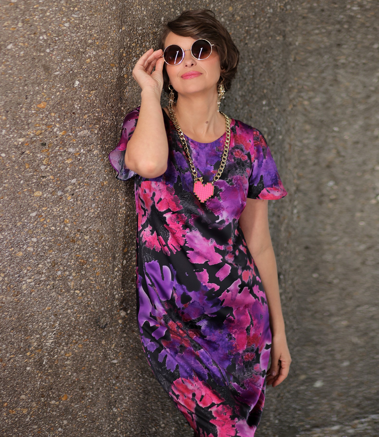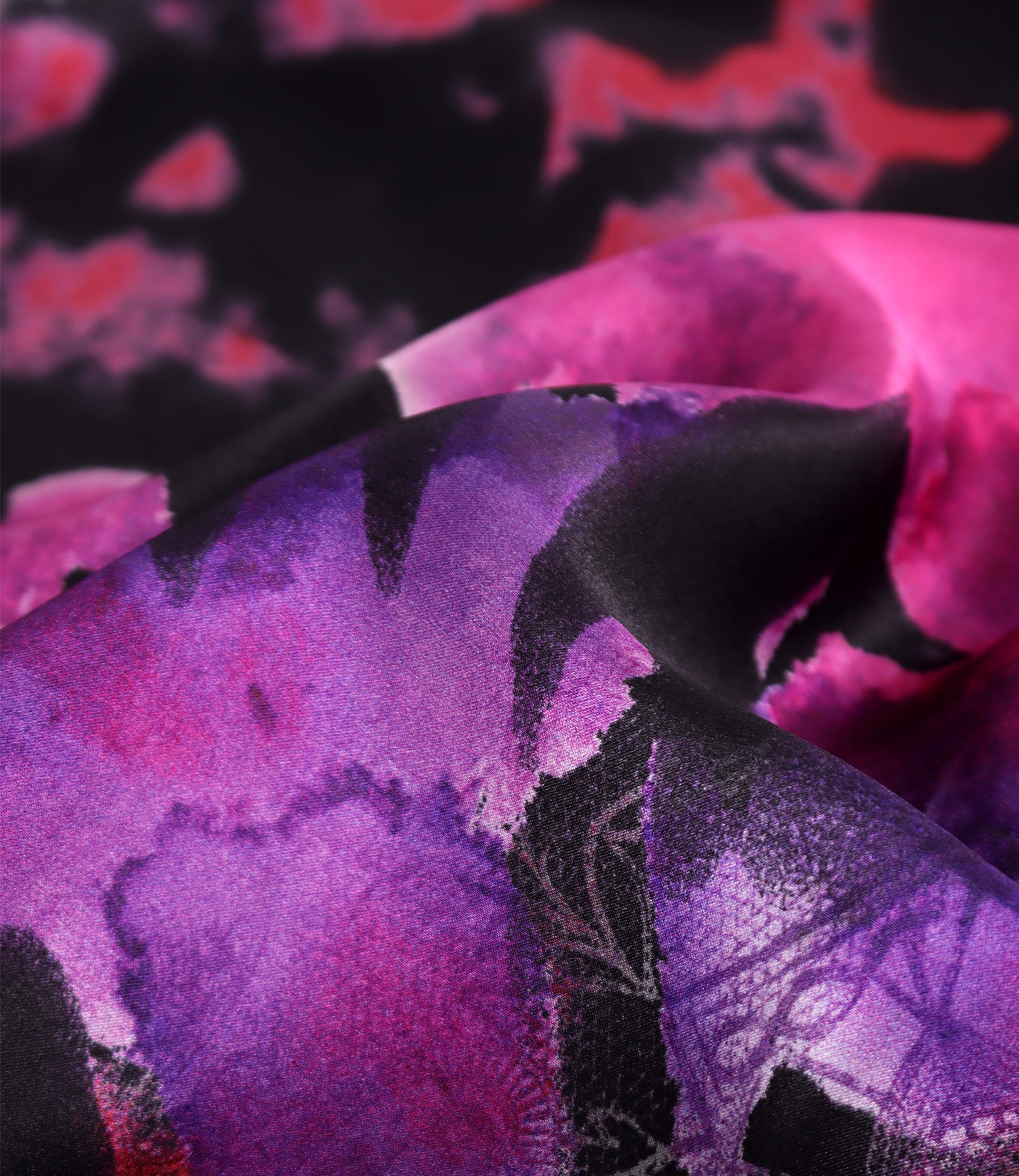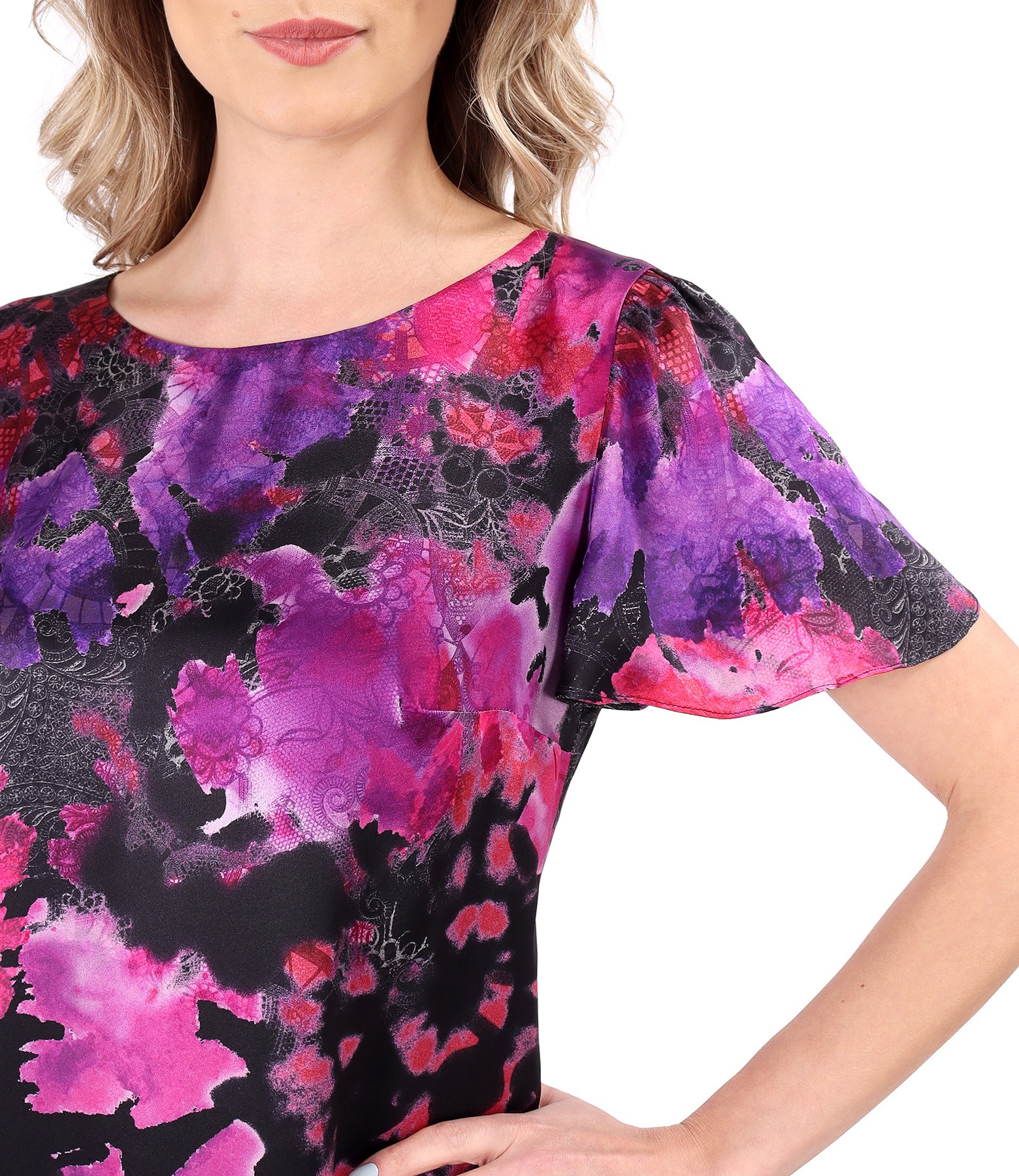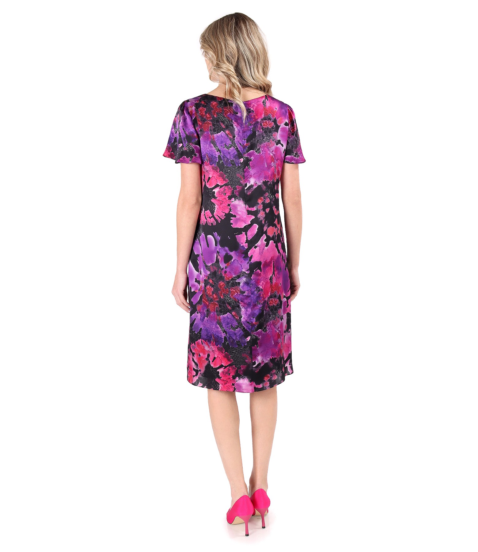 Rochie lejera din matase naturala imprimata digital. Rochia este dublata cu viscoza si are maneci scurte ample. Se inchide cu fermoar ascuns pe mijloc spate. Pozitia imprimeului variaza per produs.