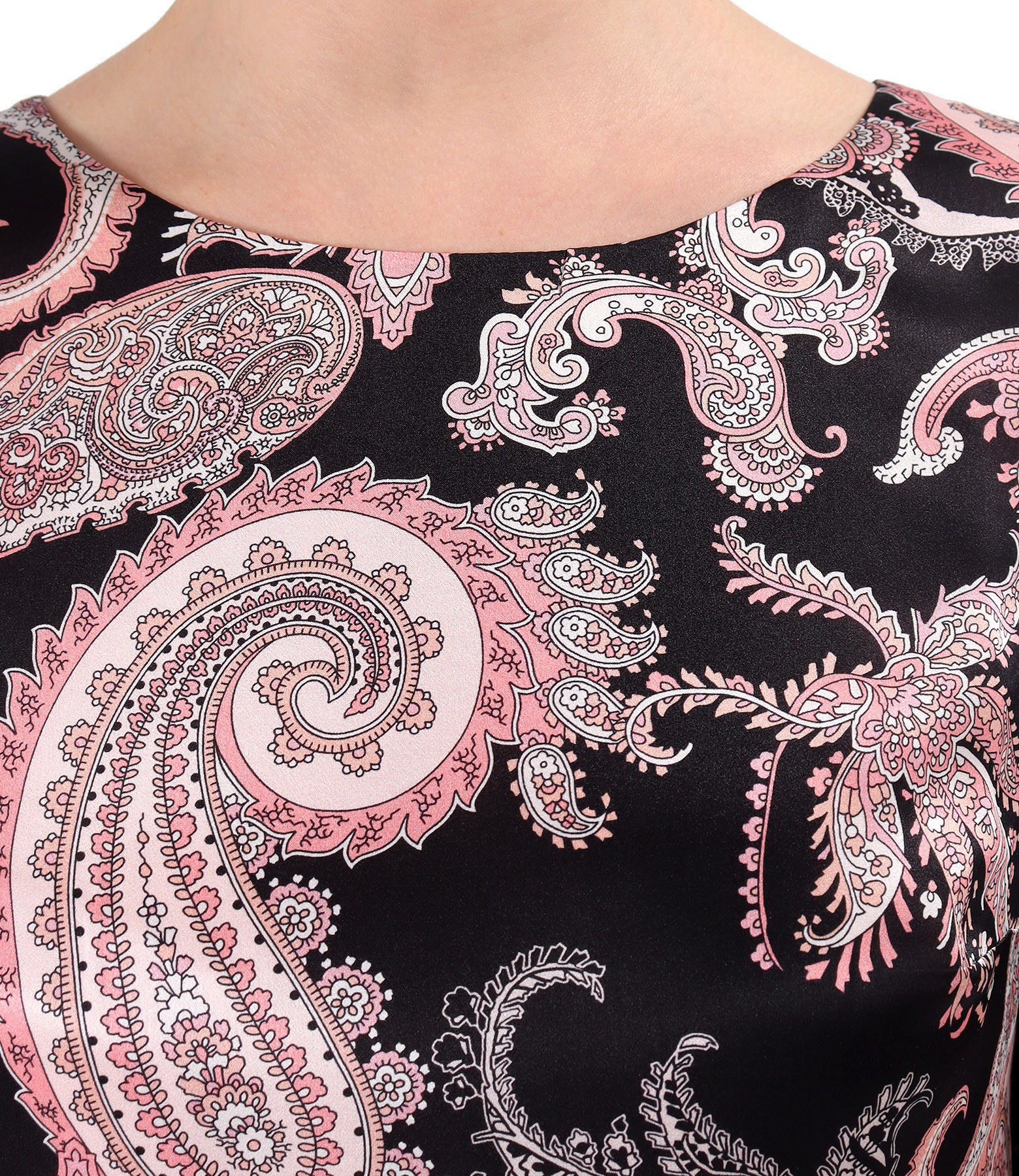 Rochie lejera din matase naturala, imprimata digital cu motive paisley. Rochia este dublata cu viscoza, are maneci 3/4 si decolteu rotund. Se inchide cu fermoar ascuns pe mijloc spate.