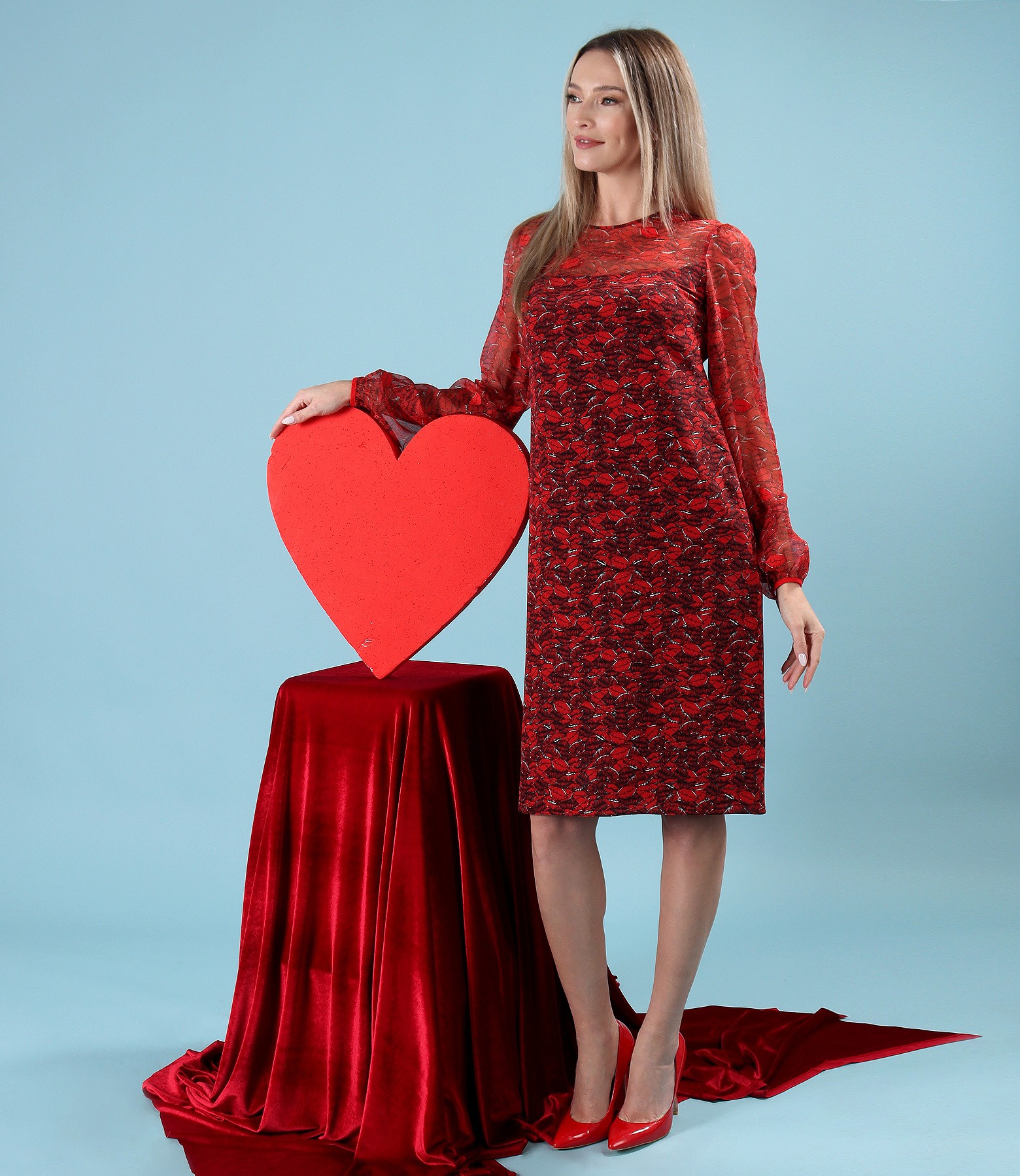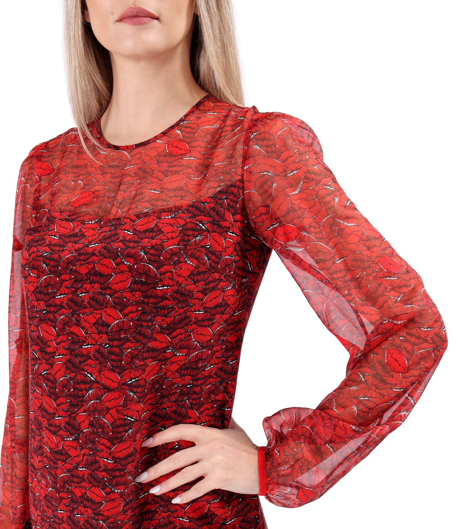 Rochie lejera din matase naturala imprimata digital cu buze, dublata cu viscoza, cu decolteu rotund si maneci lungi din voal incretite la terminatie. Se inchide cu un nasture pe mijloc spate.