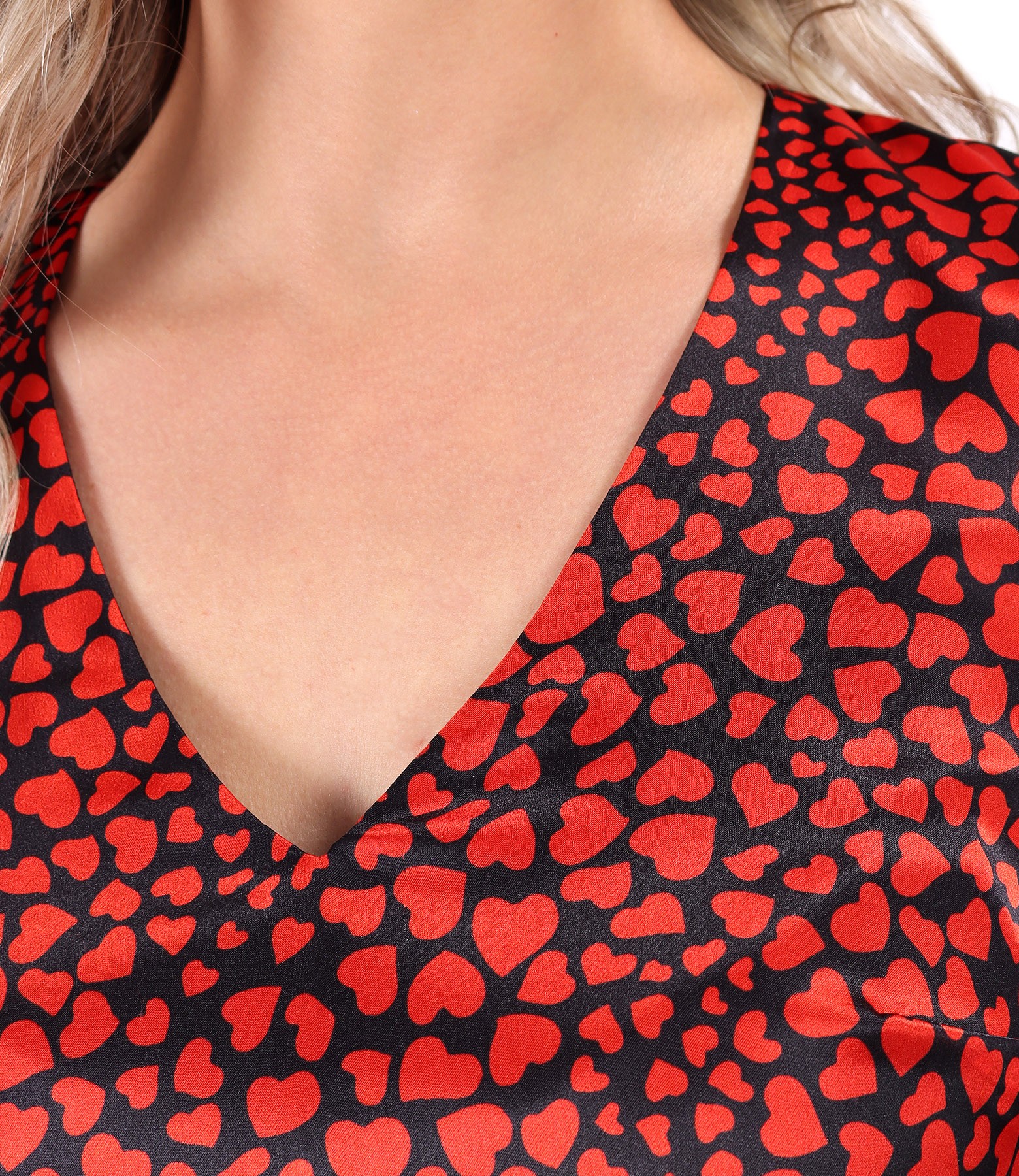 Rochie lejera din matase naturala, imprimata digital cu inimi. Rochia este dublata cu viscoza, are maneci 3/4 si decolteu in V. Se inchide cu fermoar pe mijloc spate.