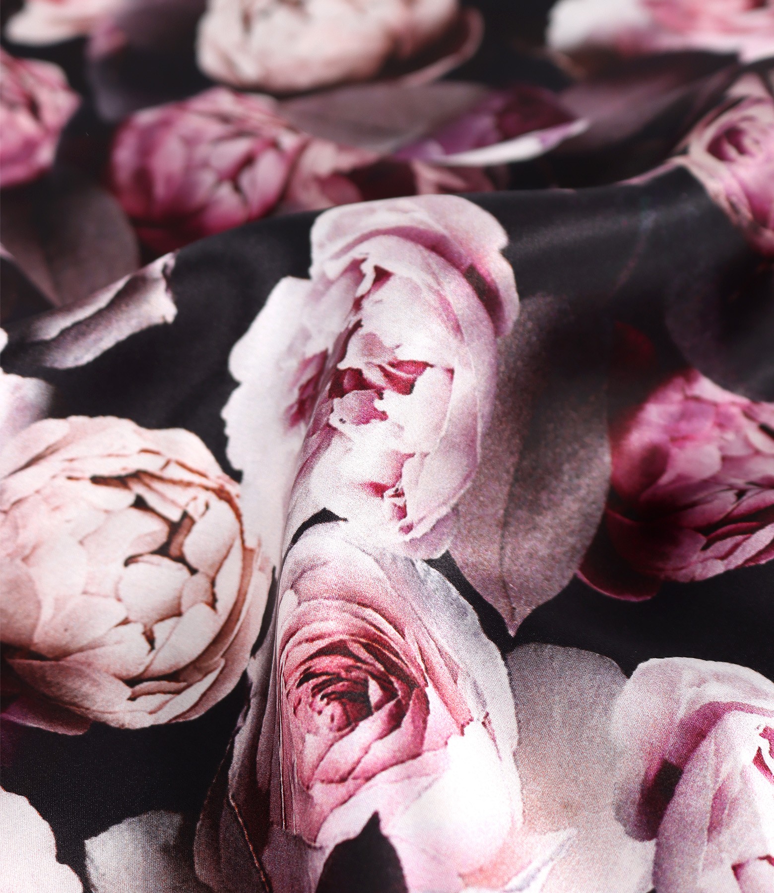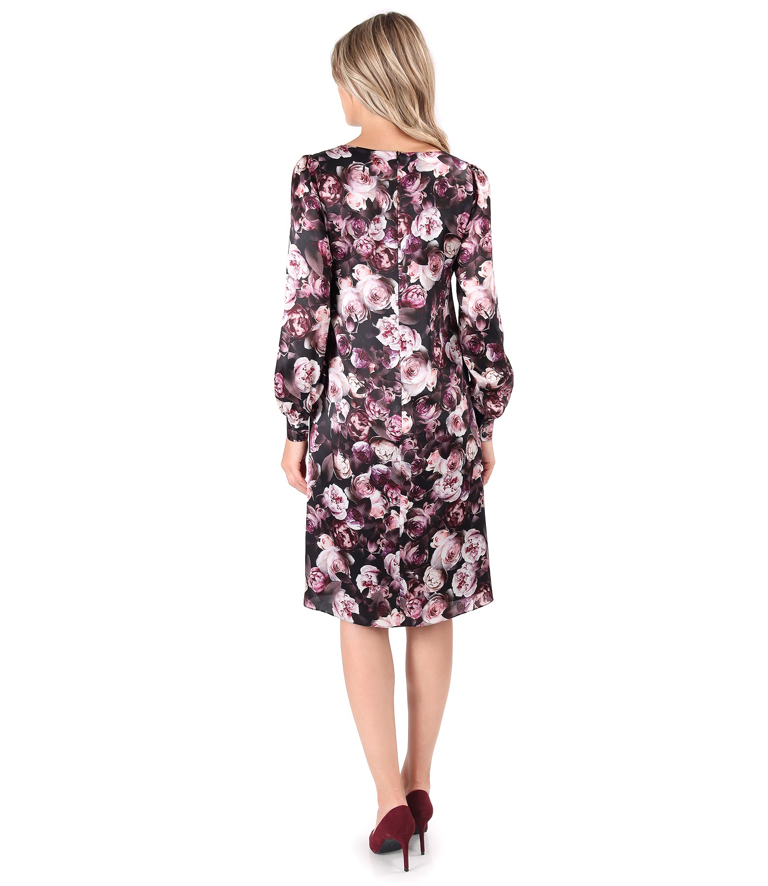 Rochie lejera din matase naturala, imprimata digital cu motive florale. Rochia este dublata cu viscoza, are maneci lungi incretite cu mansete din acelasi material cu 2 nasturi si decolteu rotund. Se inchide cu fermoar pe mijloc spate.