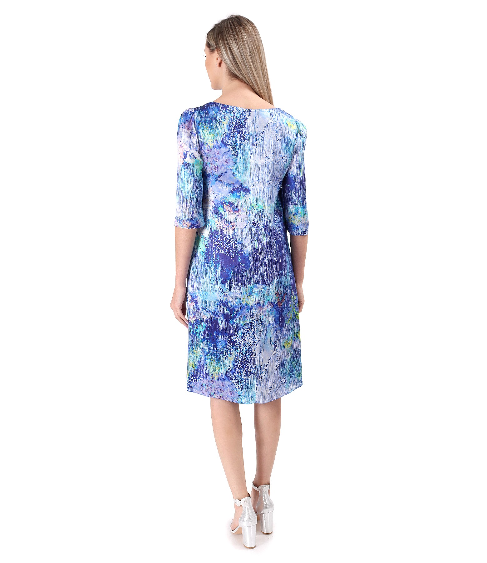Rochie lejera din matase naturala imprimata digital. Rochia este dublata cu viscoza, are maneci 3/4 si decolteu rotund. Se inchide cu fermoar ascuns pe mijloc spate. Pozitia imprimeului variaza per produs.