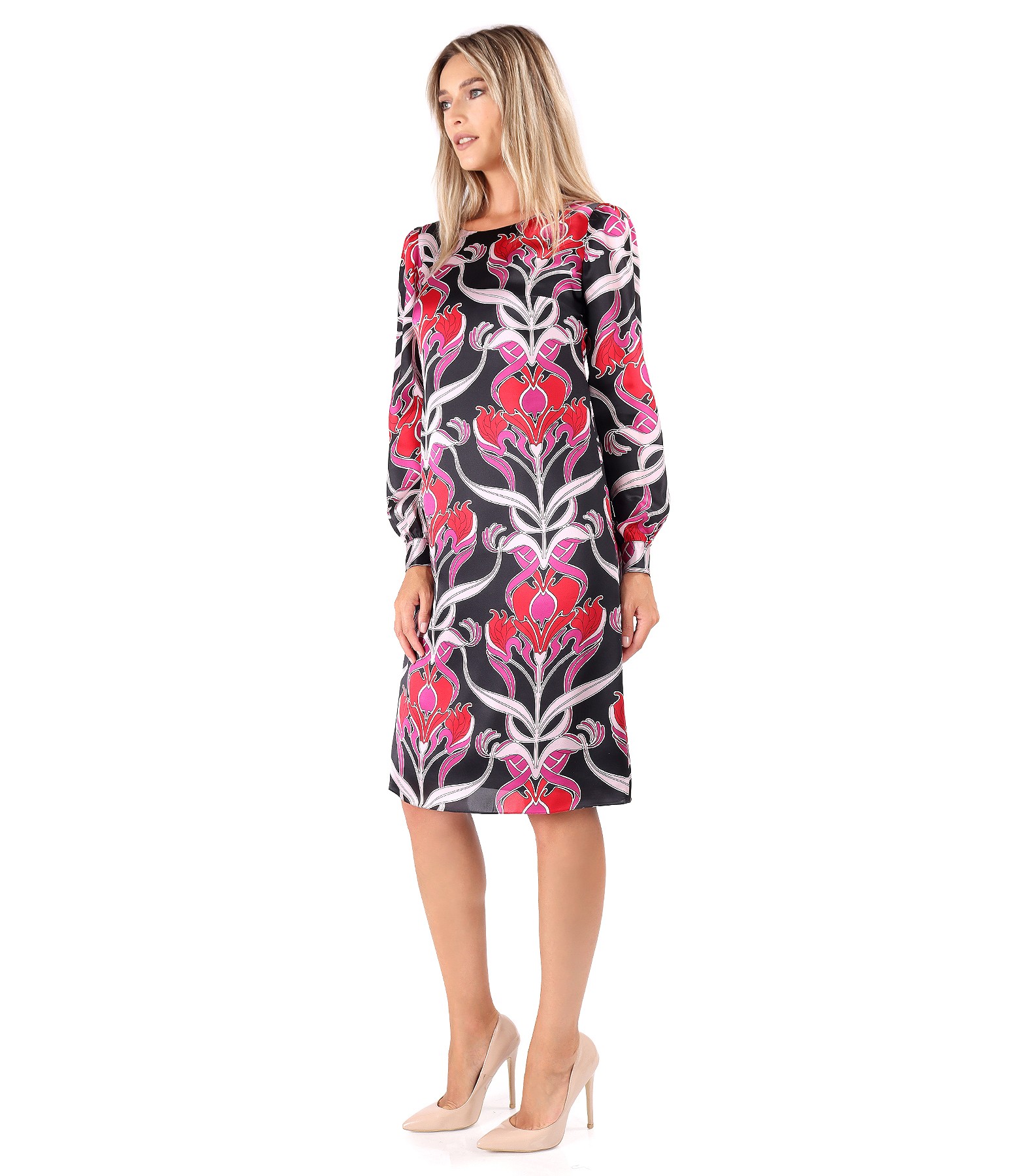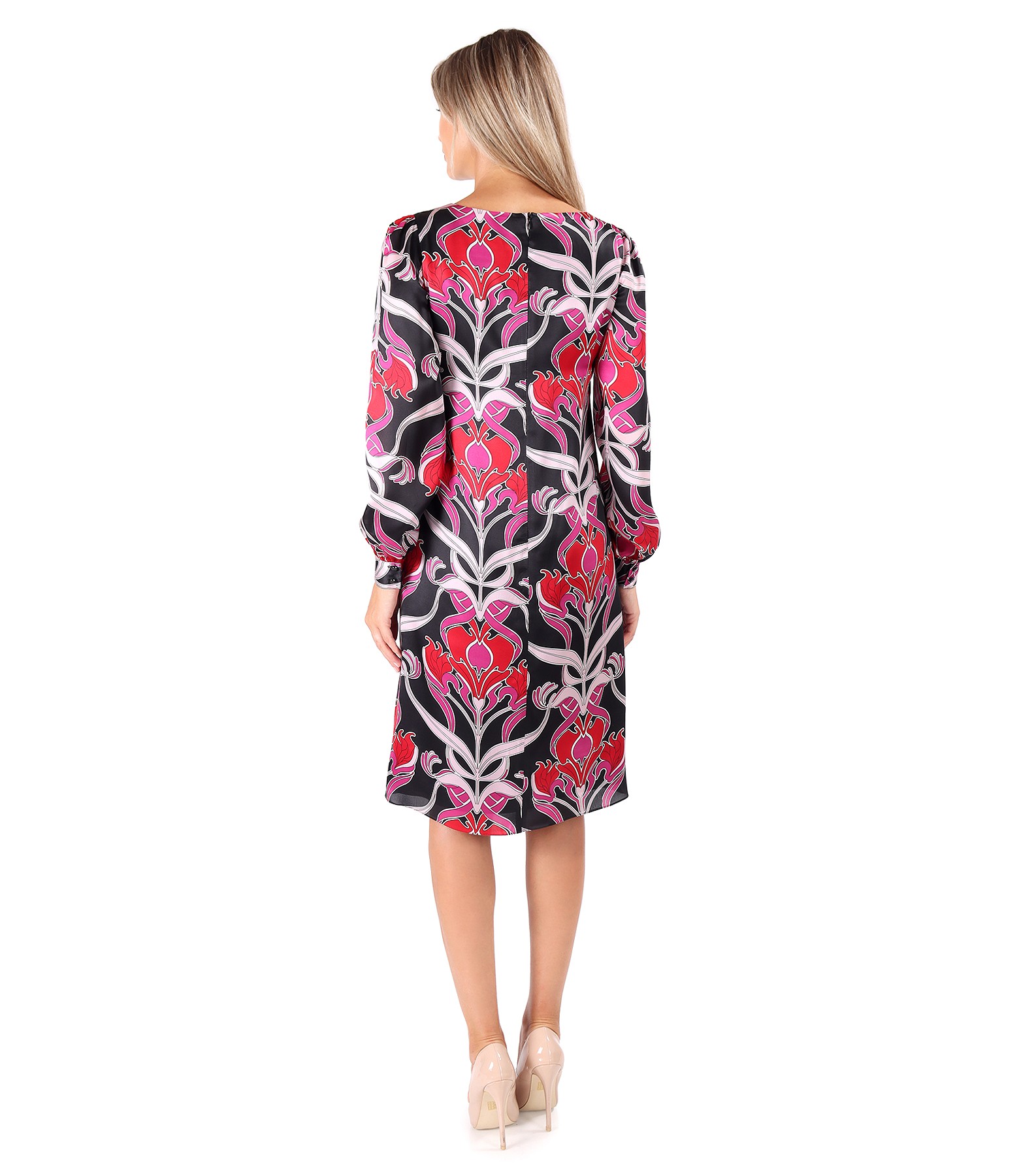 Rochie lejera din matase naturala, imprimata digital cu motive florale. Rochia este dublata cu viscoza, are maneci lungi incretite cu mansete din acelasi material cu 2 nasturi si decolteu rotund. Se inchide cu fermoar pe mijloc spate.