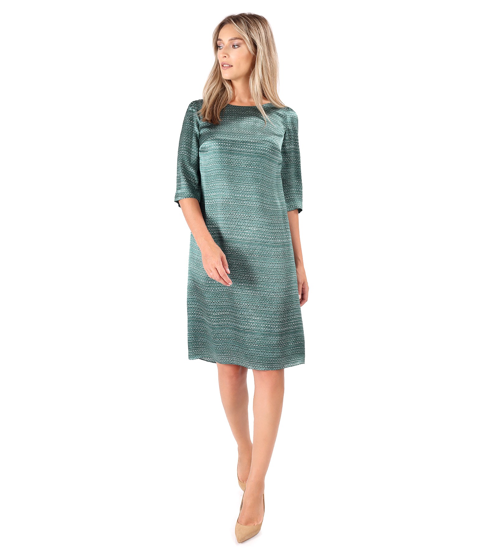 Rochie lejera din matase naturala, imprimata digital cu motive geometrice. Rochia este dublata cu viscoza, are maneci 3/4 si decolteu rotund. Se inchide cu fermoar pe mijloc spate.
