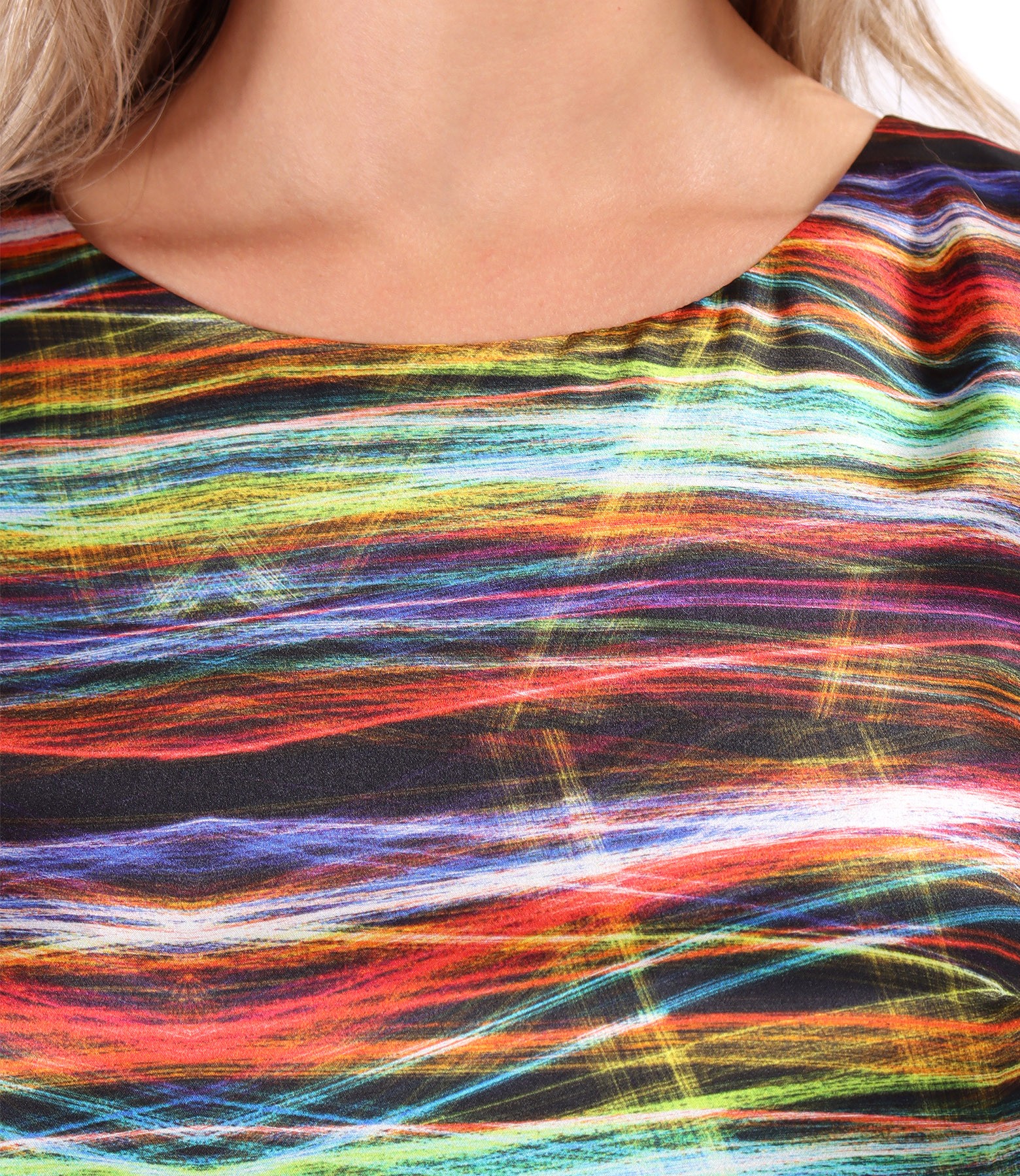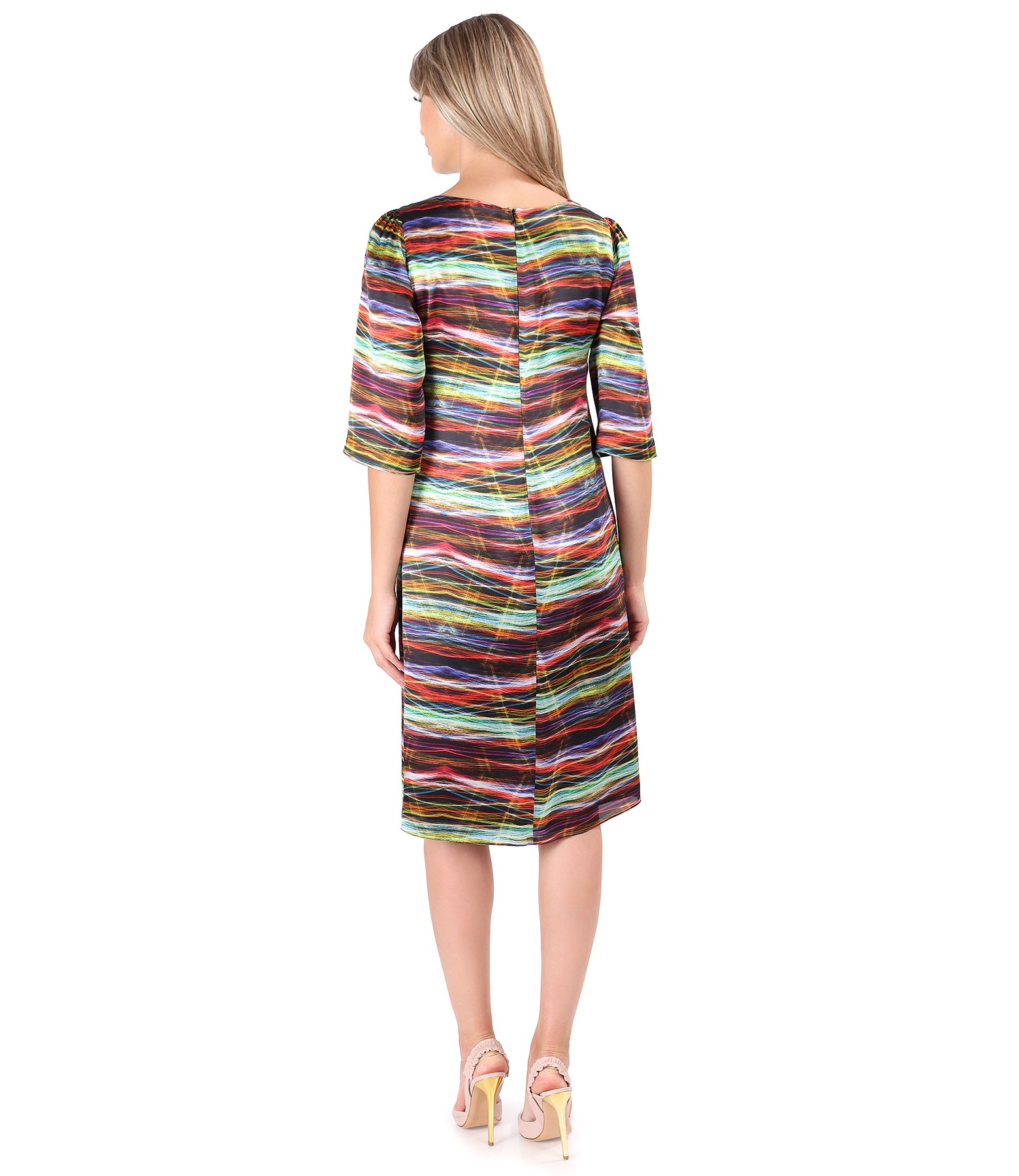 Rochie lejera din matase naturala, imprimata digital cu motive geometrice. Rochia este dublata cu viscoza, are maneci 3/4 si decolteu rotund. Se inchide cu fermoar pe mijloc spate.