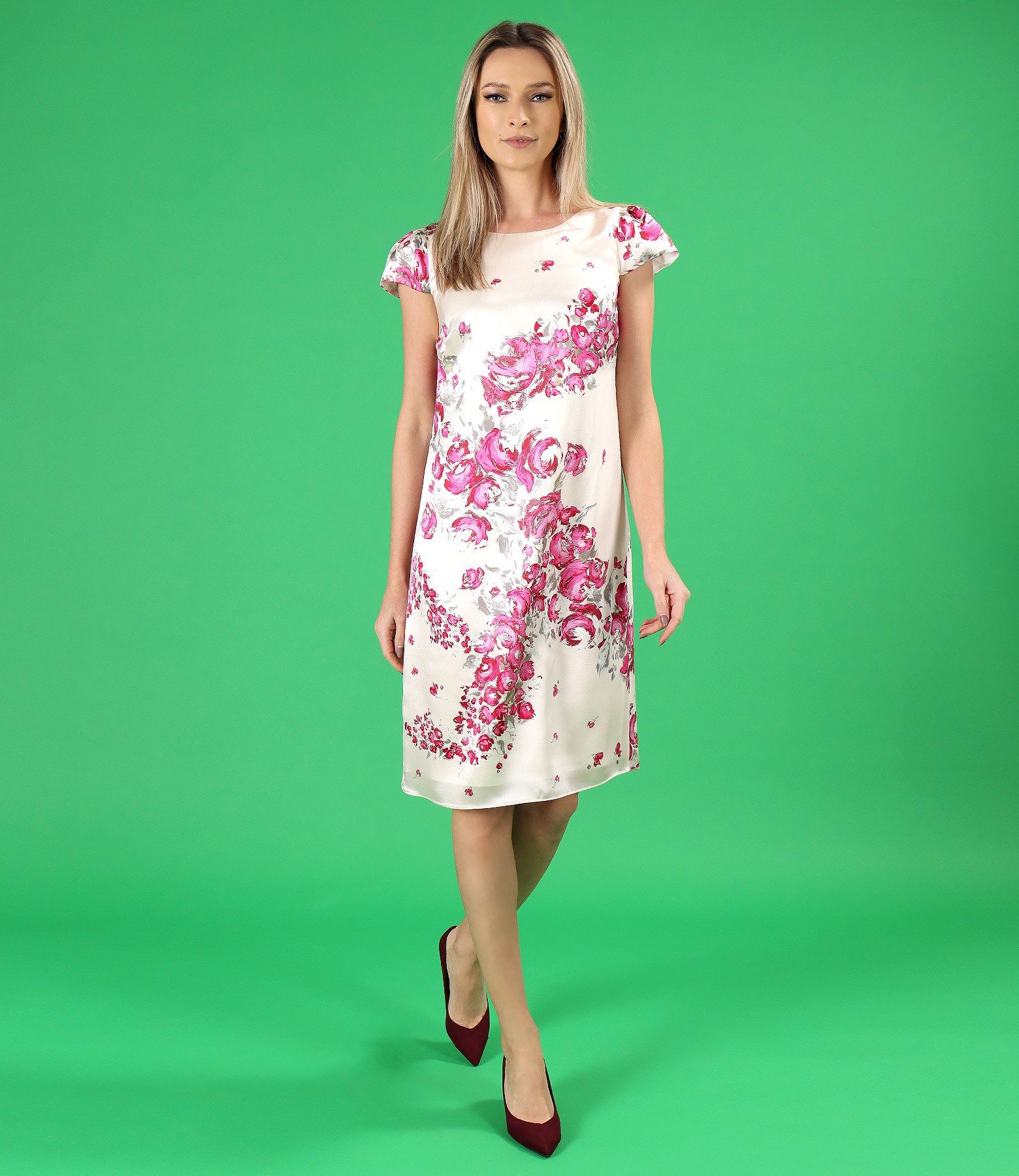 Rochie lejera din matase naturala, imprimata digital cu motive florale. Rochia este dublata cu viscoza, are maneci scurte si decolteu rotund. Se inchide cu fermoar ascuns pe mijloc spate. Pozitia imprimeului variaza per produs.