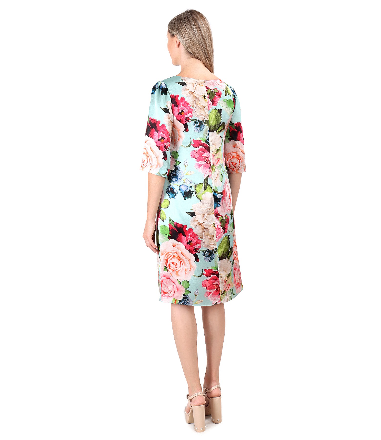 Rochie lejera din matase naturala plina, satinata, imprimata digital cu motive florale. Rochia este dublata cu viscoza, are maneci 3/4 si decolteu rotund. Se inchide cu fermoar ascuns pe mijloc spate.
