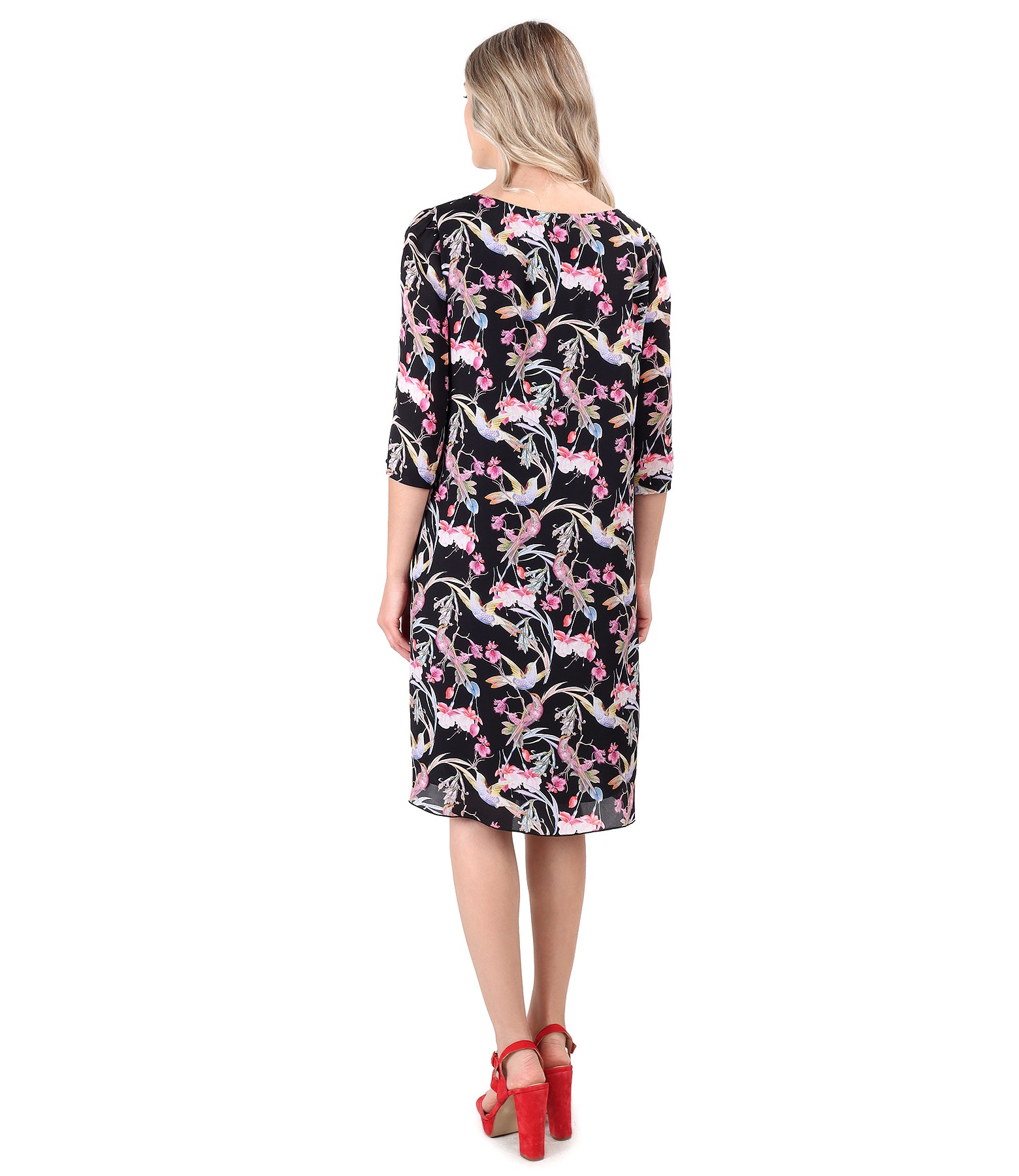 Rochie lejera din serj de viscoza imprimata cu colibri si flori, dublata cu viscoza, cu decolteu in V si maneci 3/4.