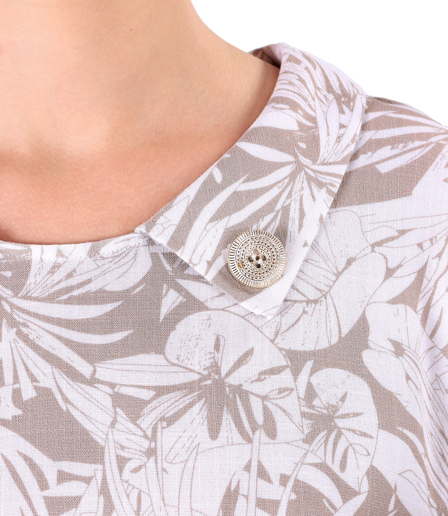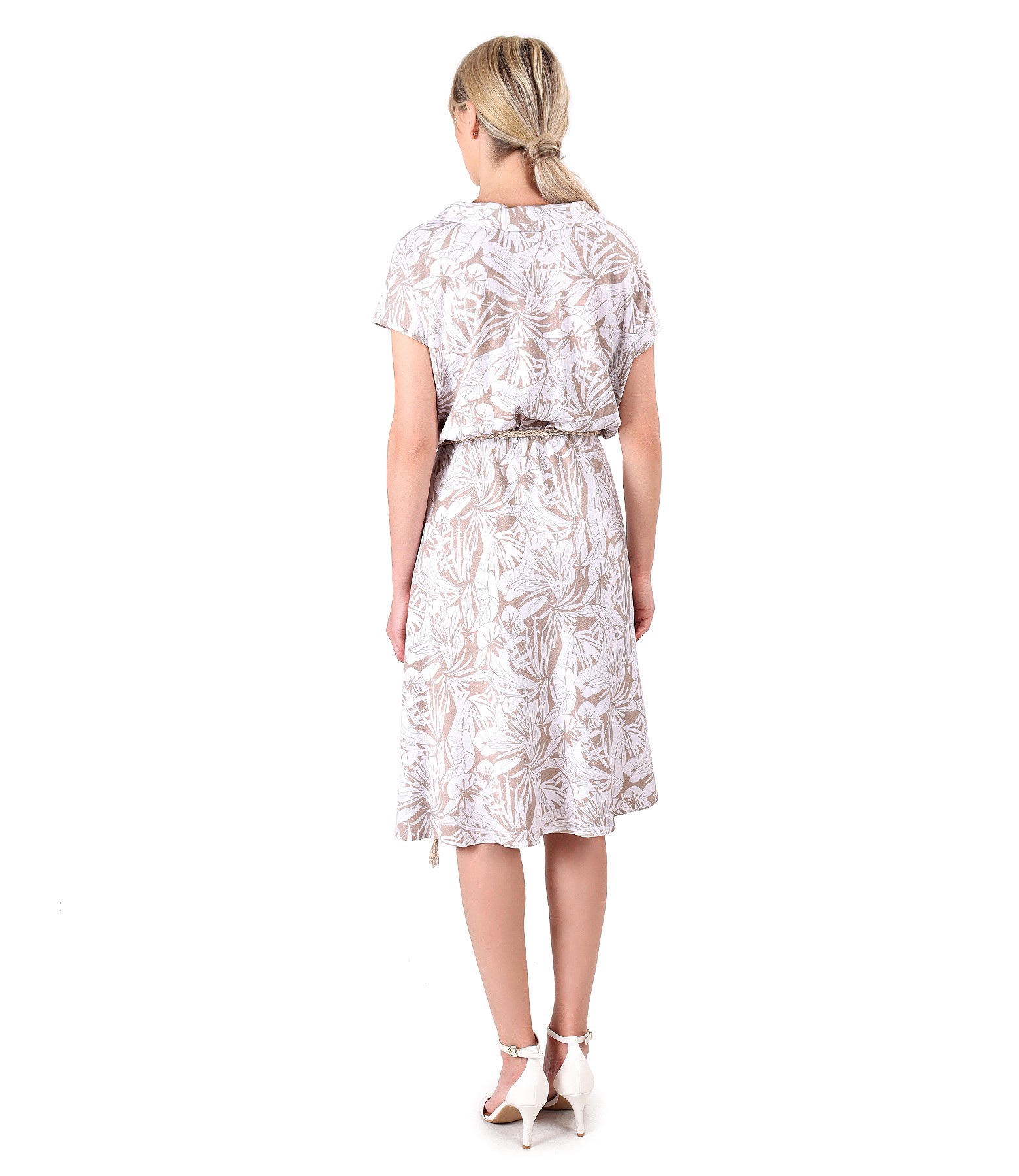 Rochie lejera de vara din viscoza elastica, imprimata cu motive florale, cu guler cu nasturi decorativi, dublata cu viscoza doar in partea de jos, cu decolteu rotund si talie incretita. Are un cordon din sfoara cu insertie aurie.