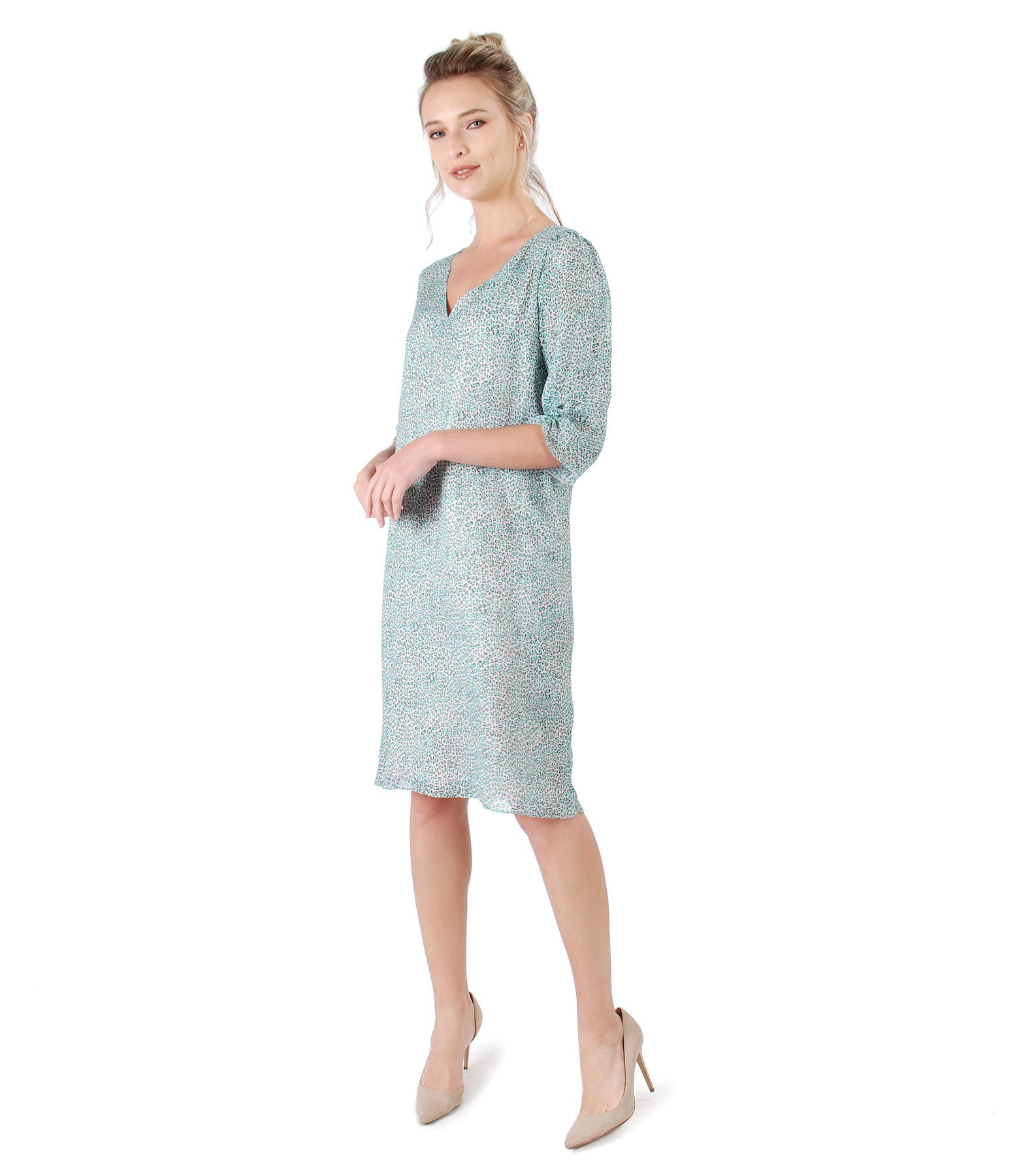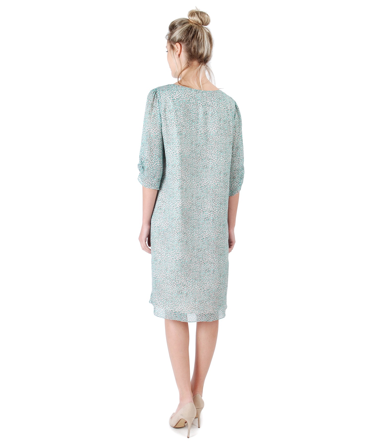 Rochie lejera din viscoza imprimata, dublata cu viscoza, cu decolteu rotund si maneci 3/4 cu aplicatie de cristale la terminatie maneci.