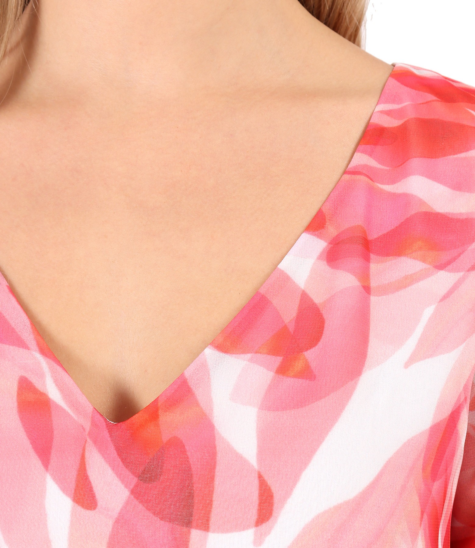 Rochie evazata din voal cu imprimeu floral, lejera, dublata cu viscoza, cu decolteu in V si maneci 3/4.
