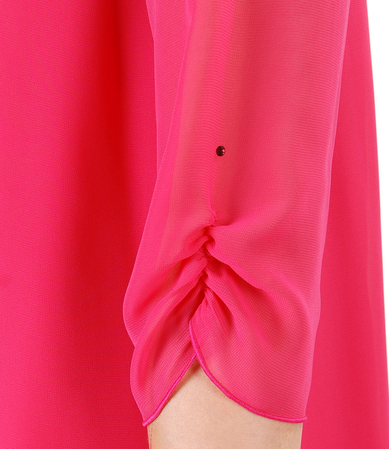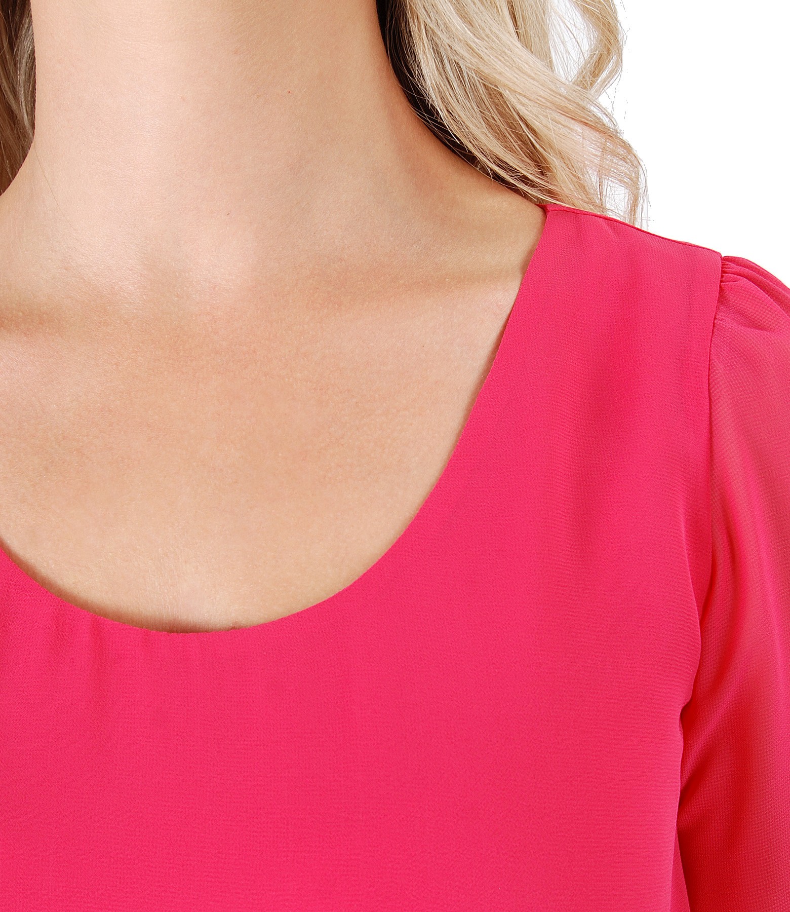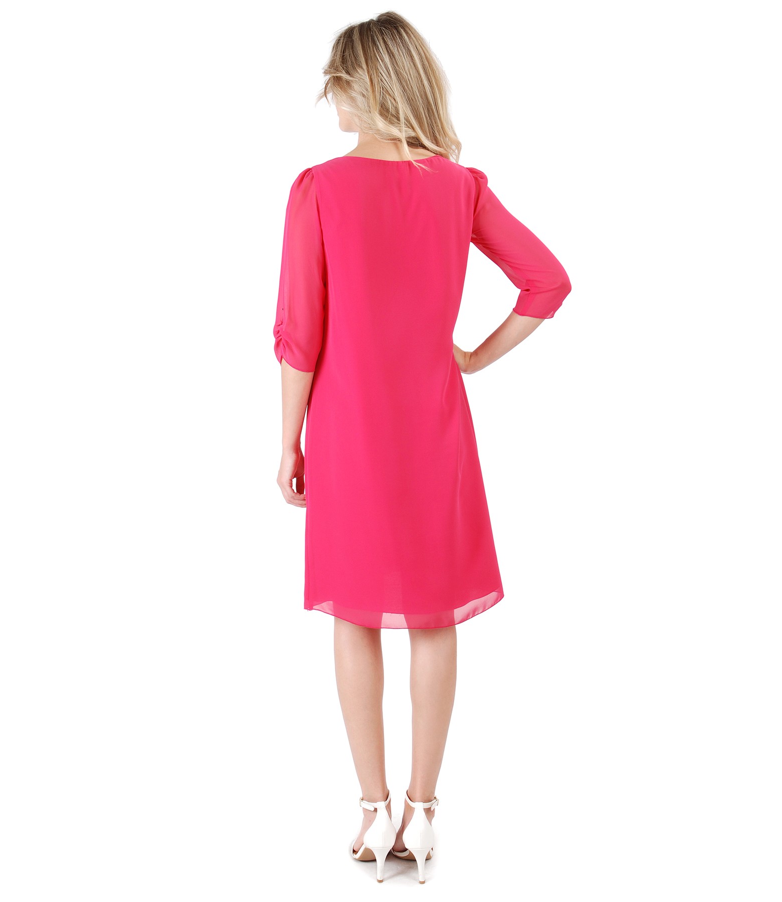 Rochie lejera din voal uni, dublata cu viscoza, cu decolteu rotund si maneci 3/4 cu aplicatie de cristale la terminatie maneci.