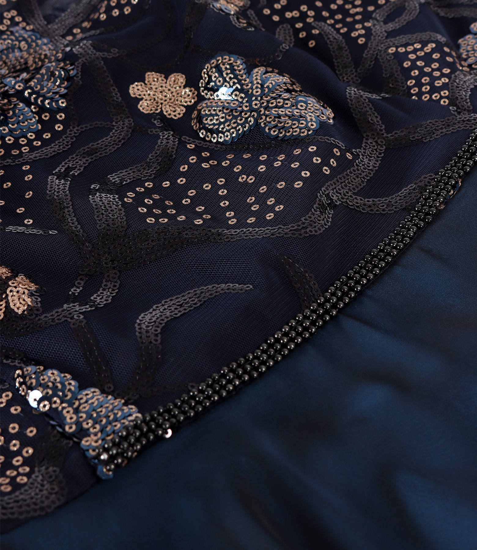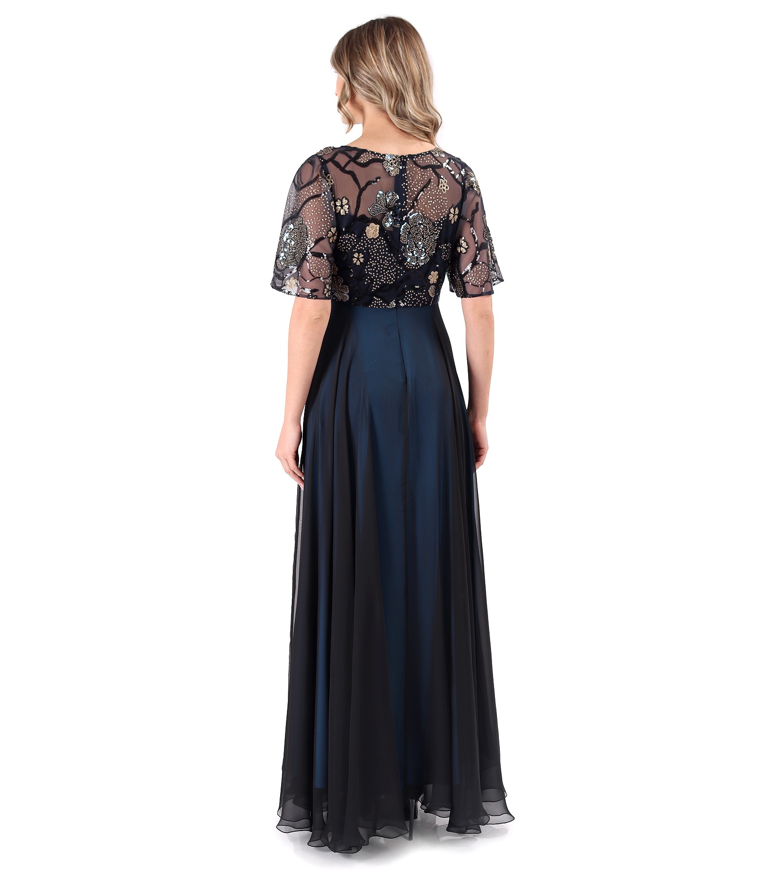 Rochie lunga cu bust si maneci ample din dantela cu paiete, cu fusta din voal satinat fin negru, cu decolteu transparent si cu aplicatie din margele in talie. Captusita cu saten in contrast, negru la bust si albastru la fusta. Se inchide cu fermoar ascuns mijloc spate.
