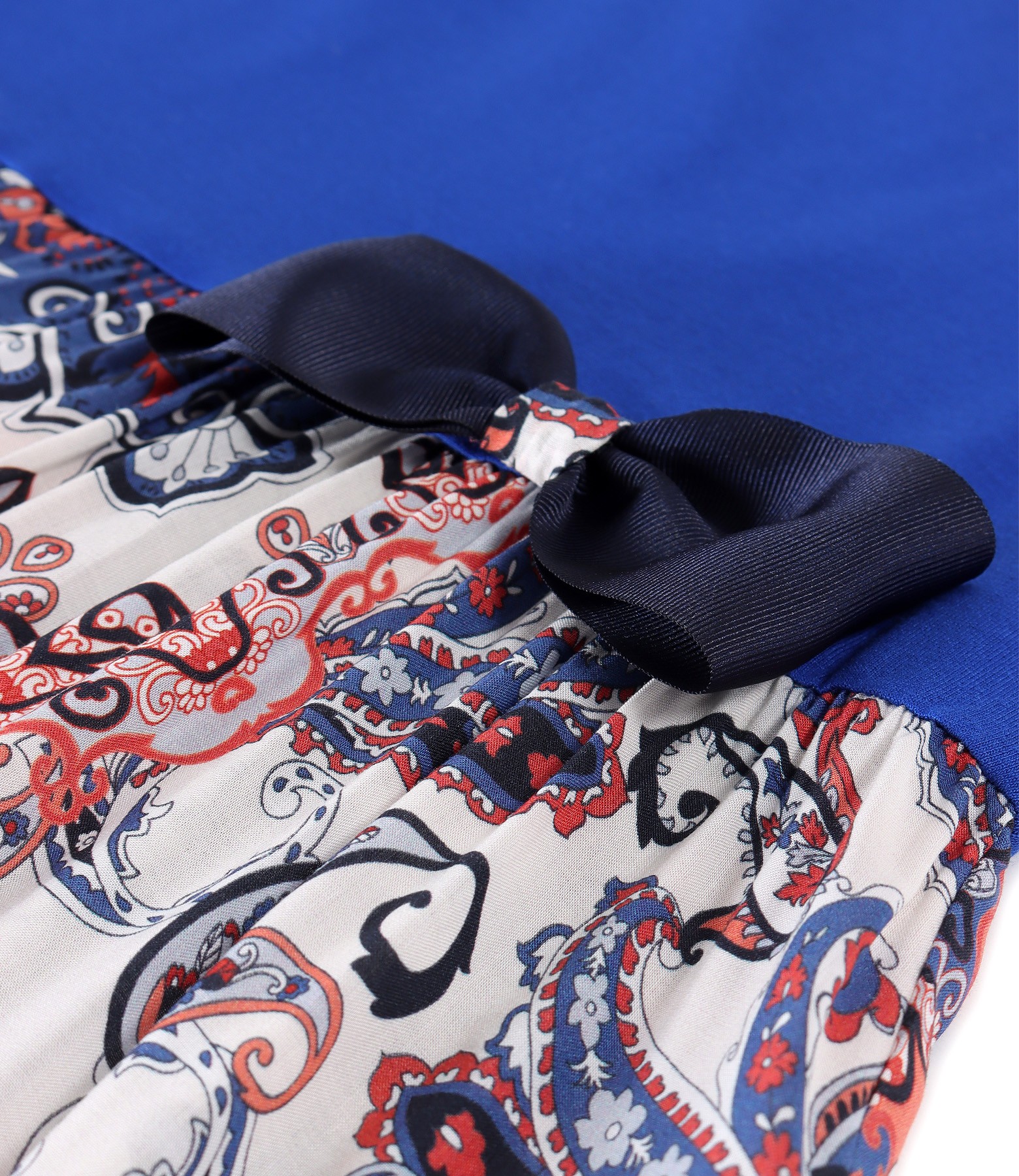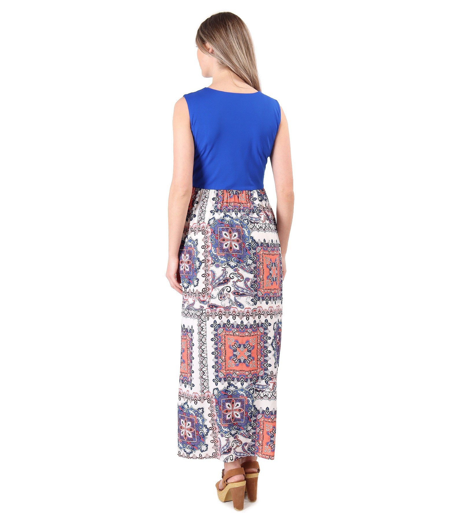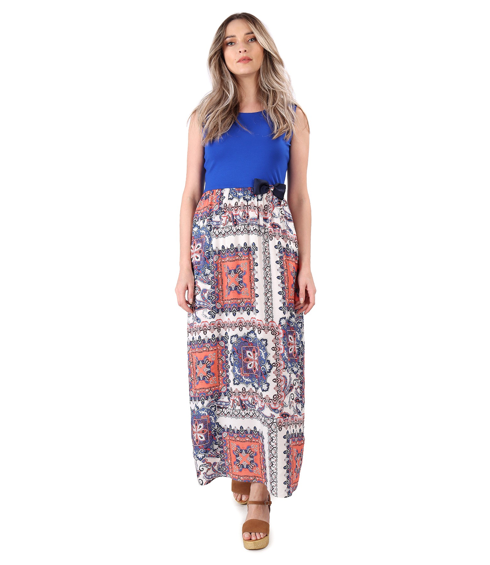 Rochie lunga cu fusta din viscoza imprimata, necaptusita, cu partea de sus din jerse elastic uni, captusita, fara maneci, si cu funda din rips decorativa in talie. Pozitia imprimeului variaza per produs.