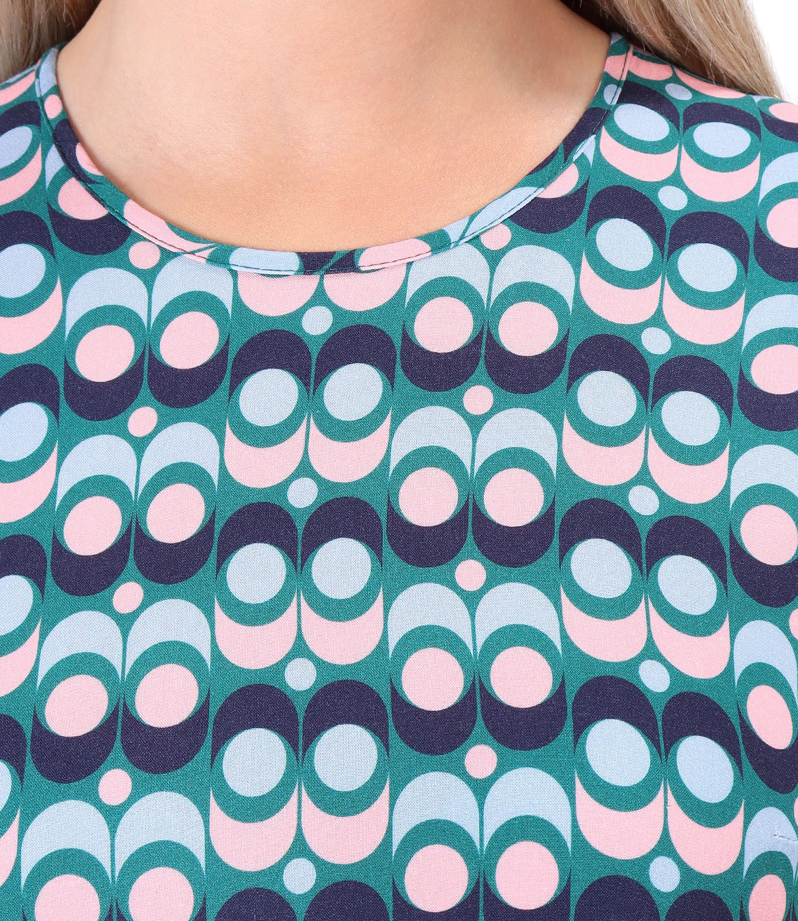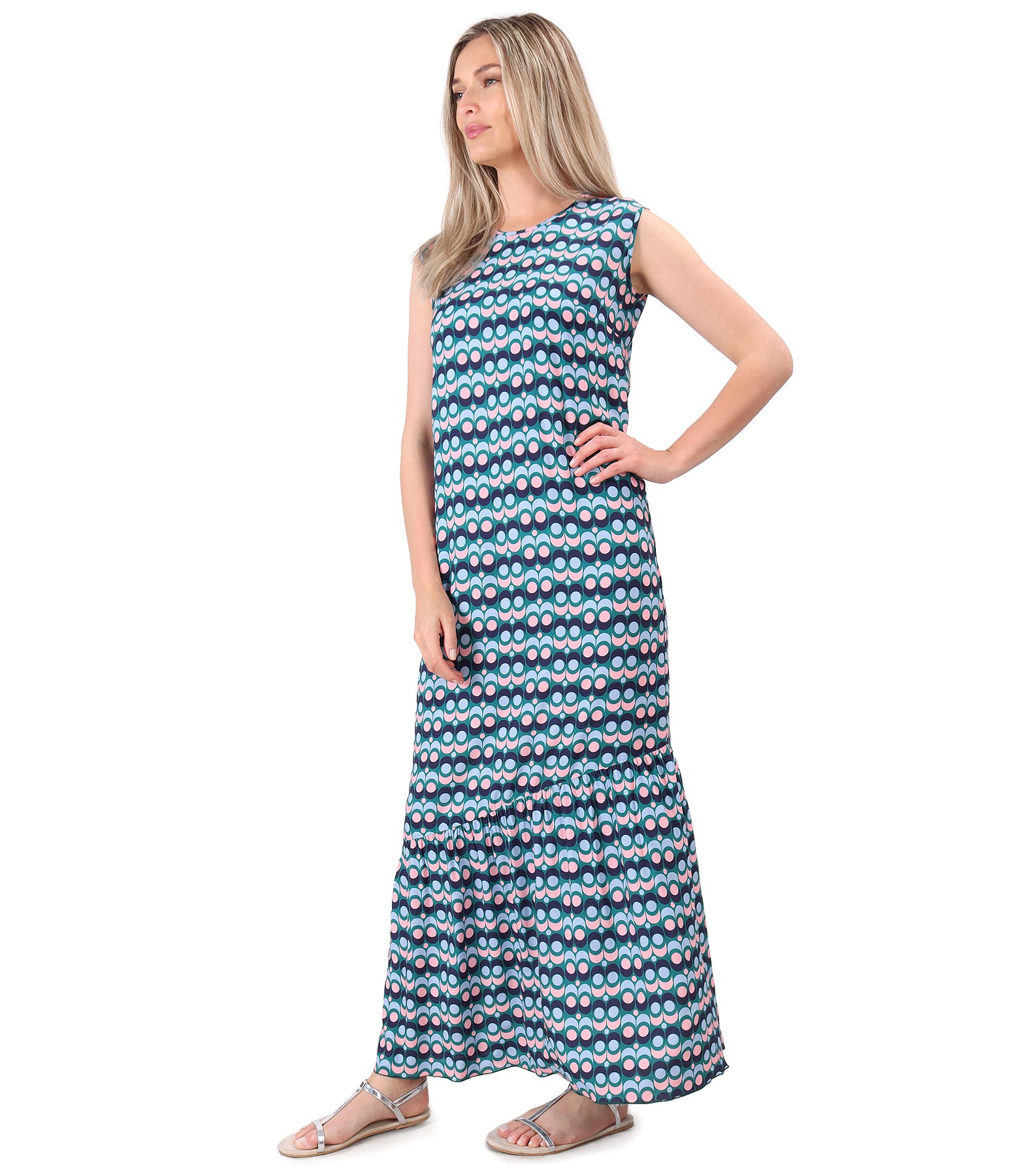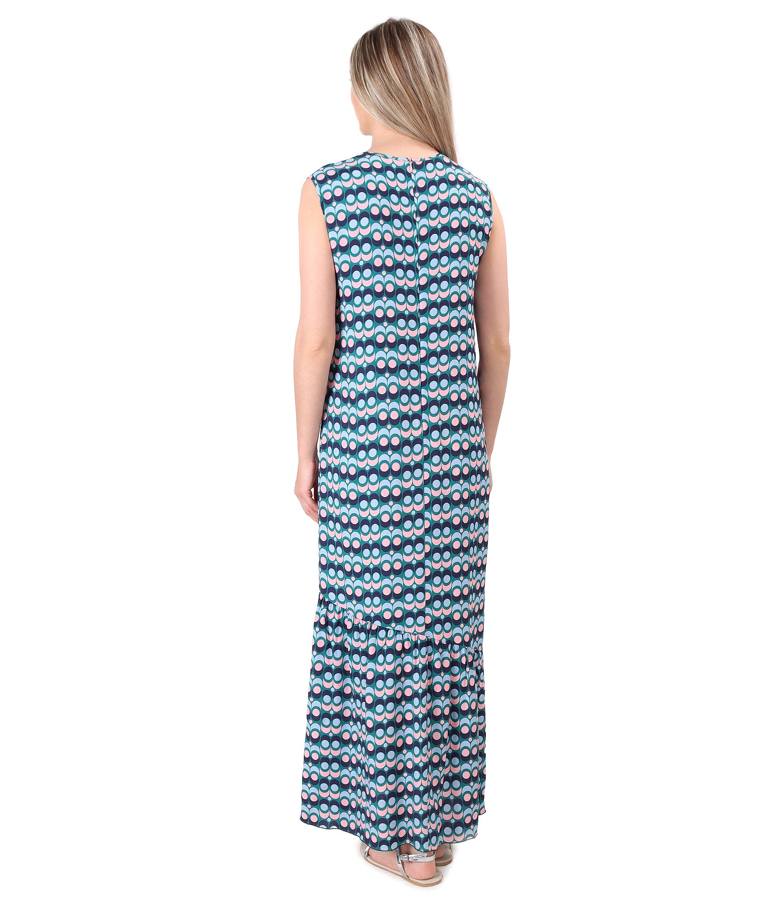 Rochie lunga cu volan din viscoza imprimata cu motive geometrice, necaptusita, fara maneci si cu decolteu rotund. Se inchide cu un nasture pe mijloc spate.
