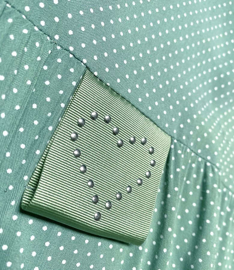 Rochie lunga cu volane din viscoza imprimata cu picouri, necaptusita, cu maneci scurte, decolteu in V si aplicatie decorativa in forma de inima in talie. Nu are sistem de inchidere.