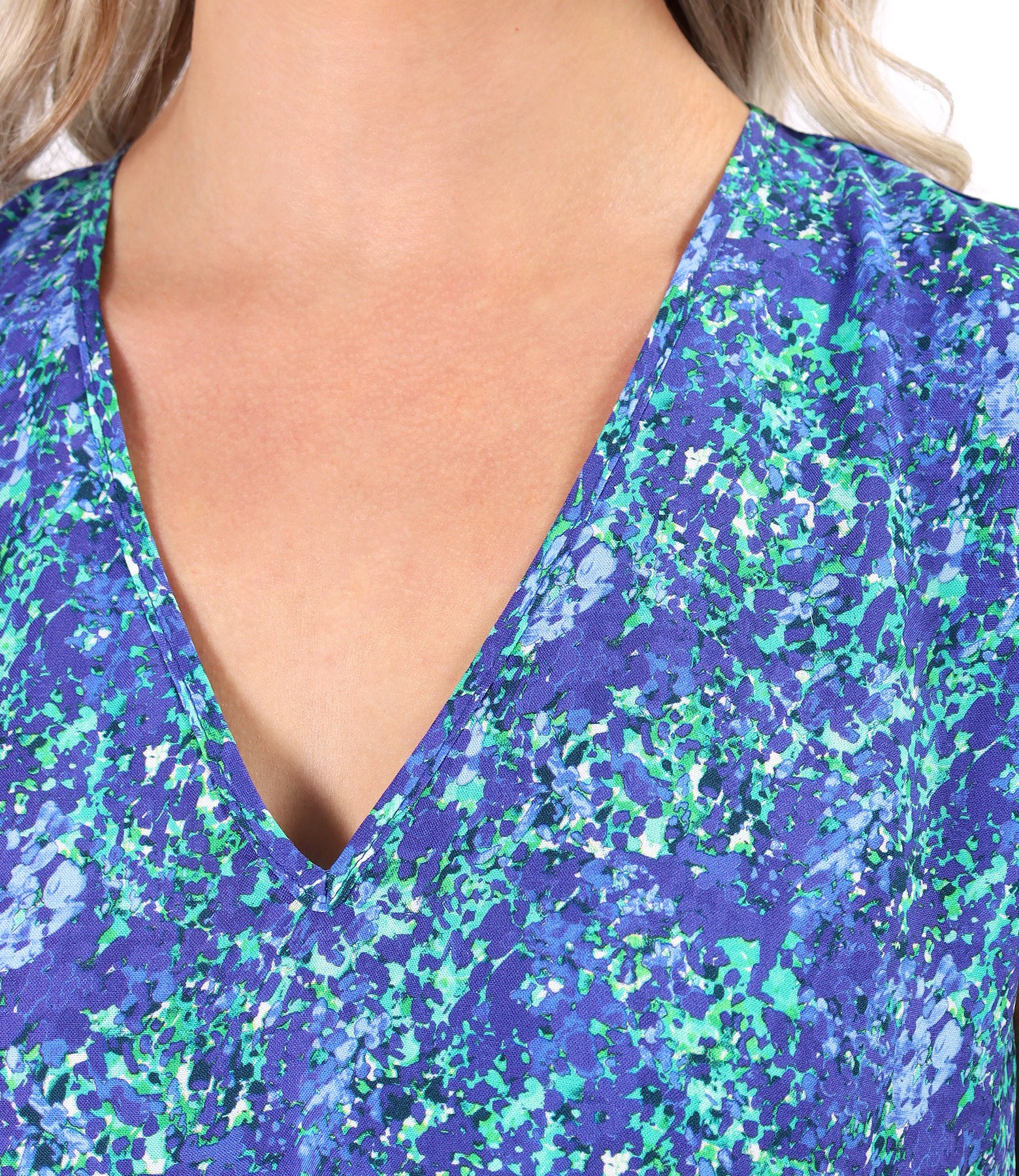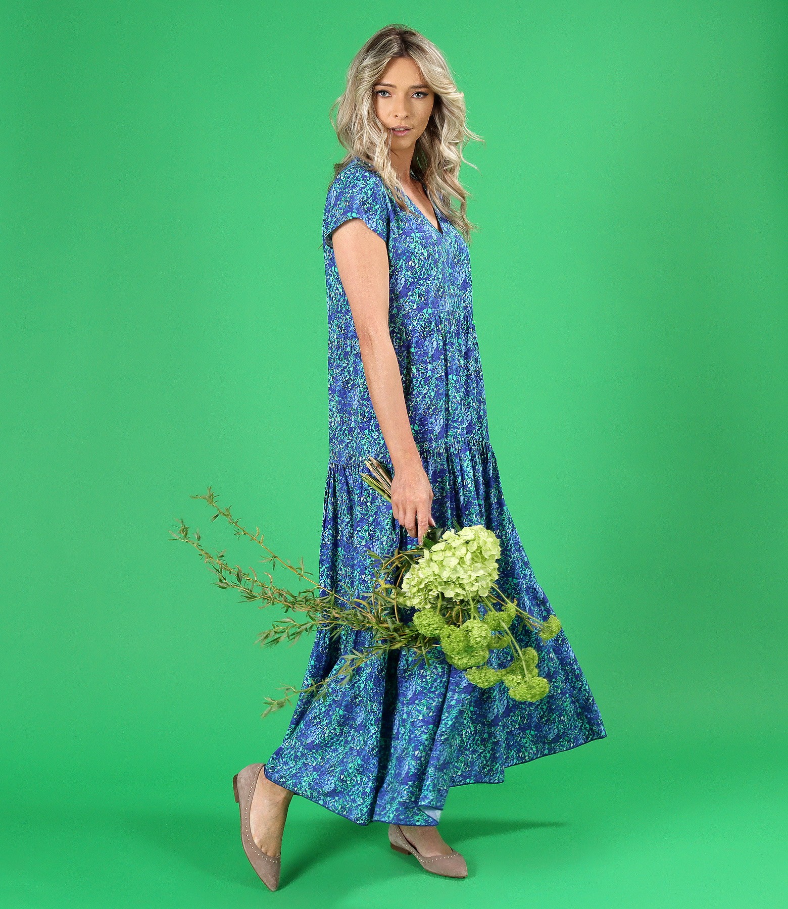 Rochie lunga cu volane din viscoza imprimata cu motive florale, necaptusita, cu maneci scurte si decolteu in V. Nu are sistem de inchidere.