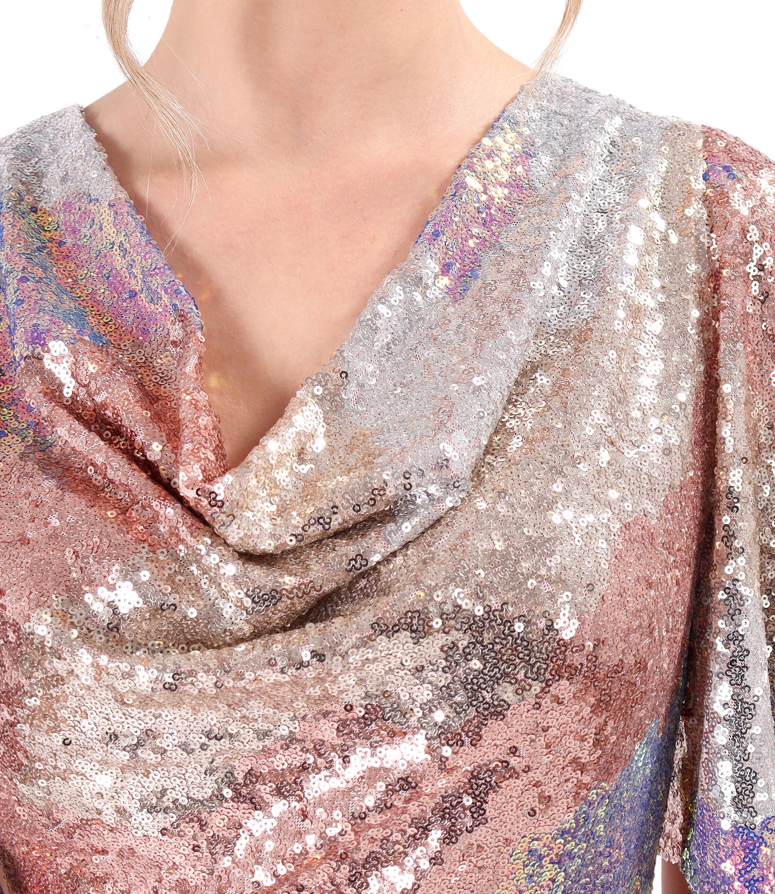 Rochie lunga de ocazie cu bust si maneci ample cu paiete, cu fusta din voal sidefat, captusita cu saten elastic si cu falduri la decolteu. Are lant decorativ auriu in talie. Se inchide cu fermoar ascuns pe mijloc spate.