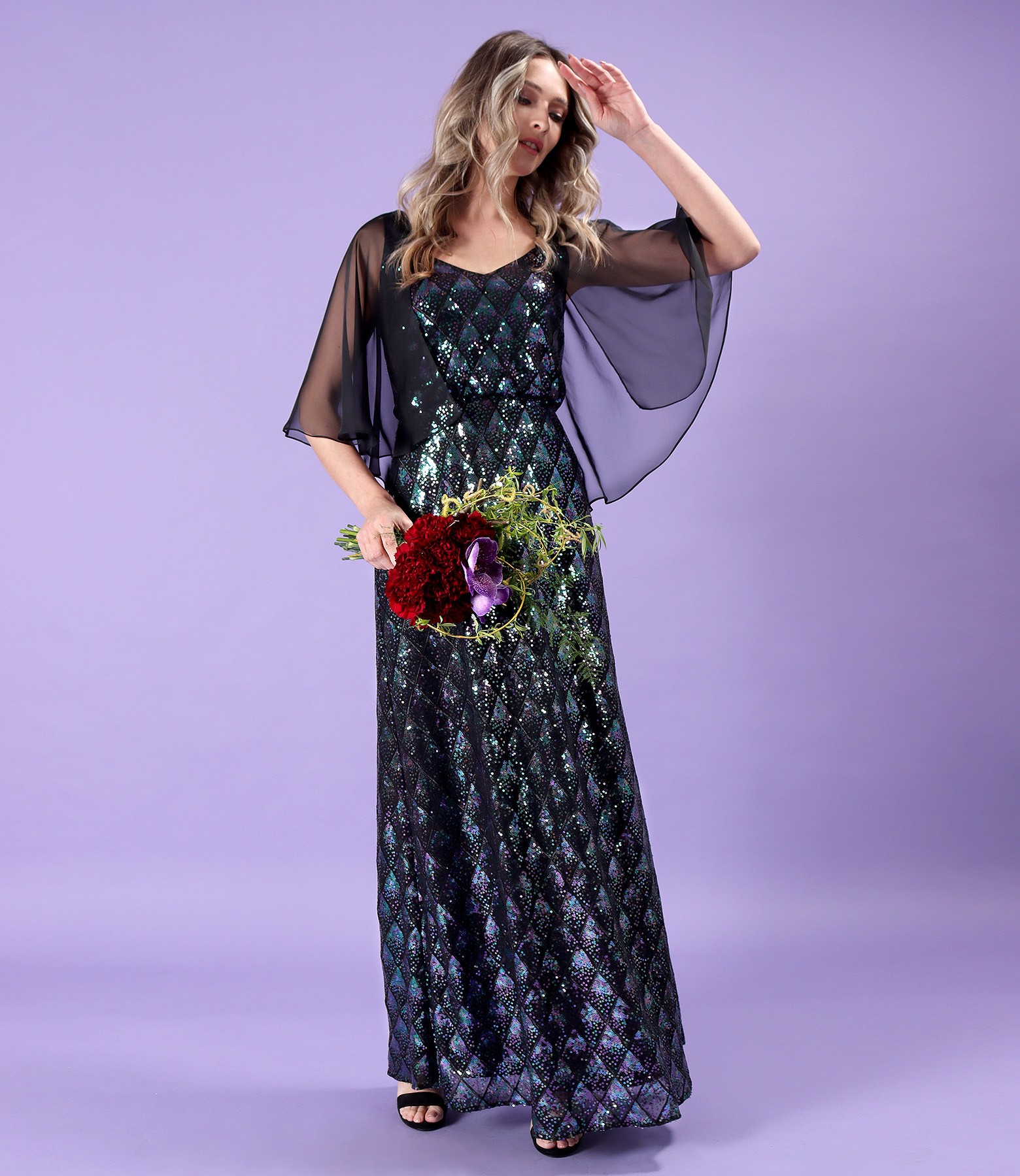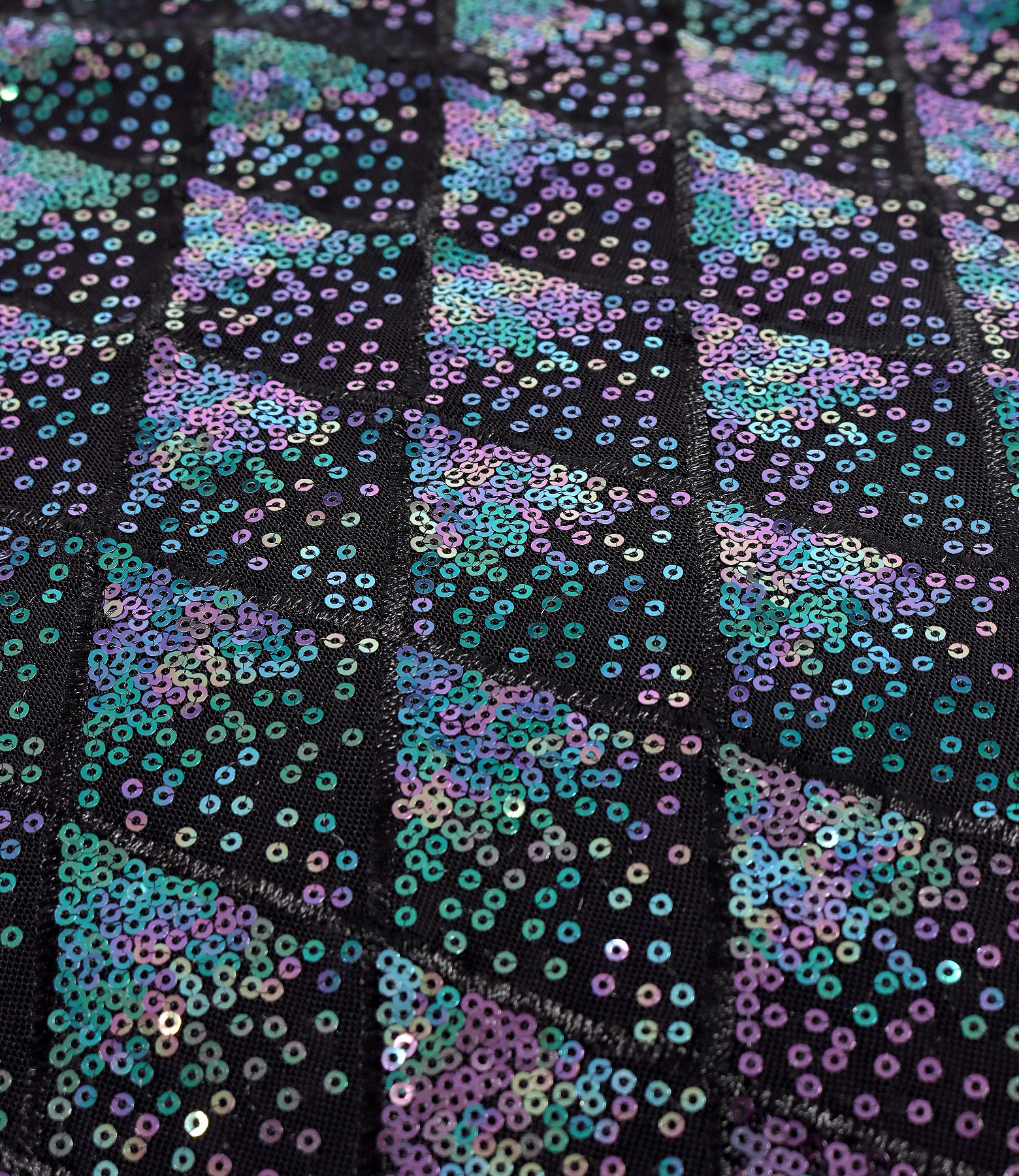 Rochie lunga de seara din paiete multicolore in forma de romburi, dublata cu saten elastic si cu capa din voal tip mouselline. Capa nu este detasabila. Rochia este lejera si elastica, se potriveste si cu o marime mai mica. Se inchide cu fermoar ascuns pe mijloc spate.