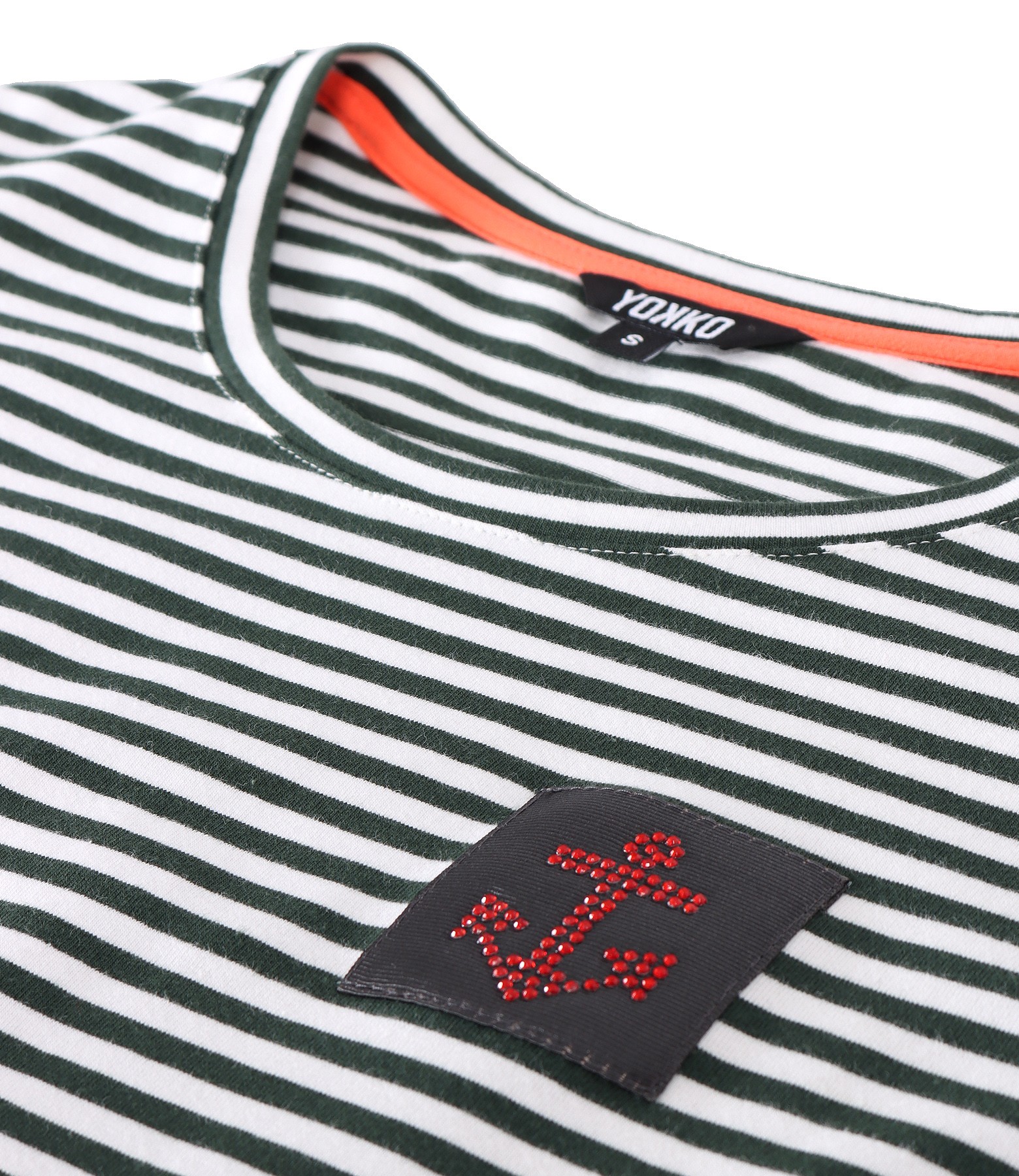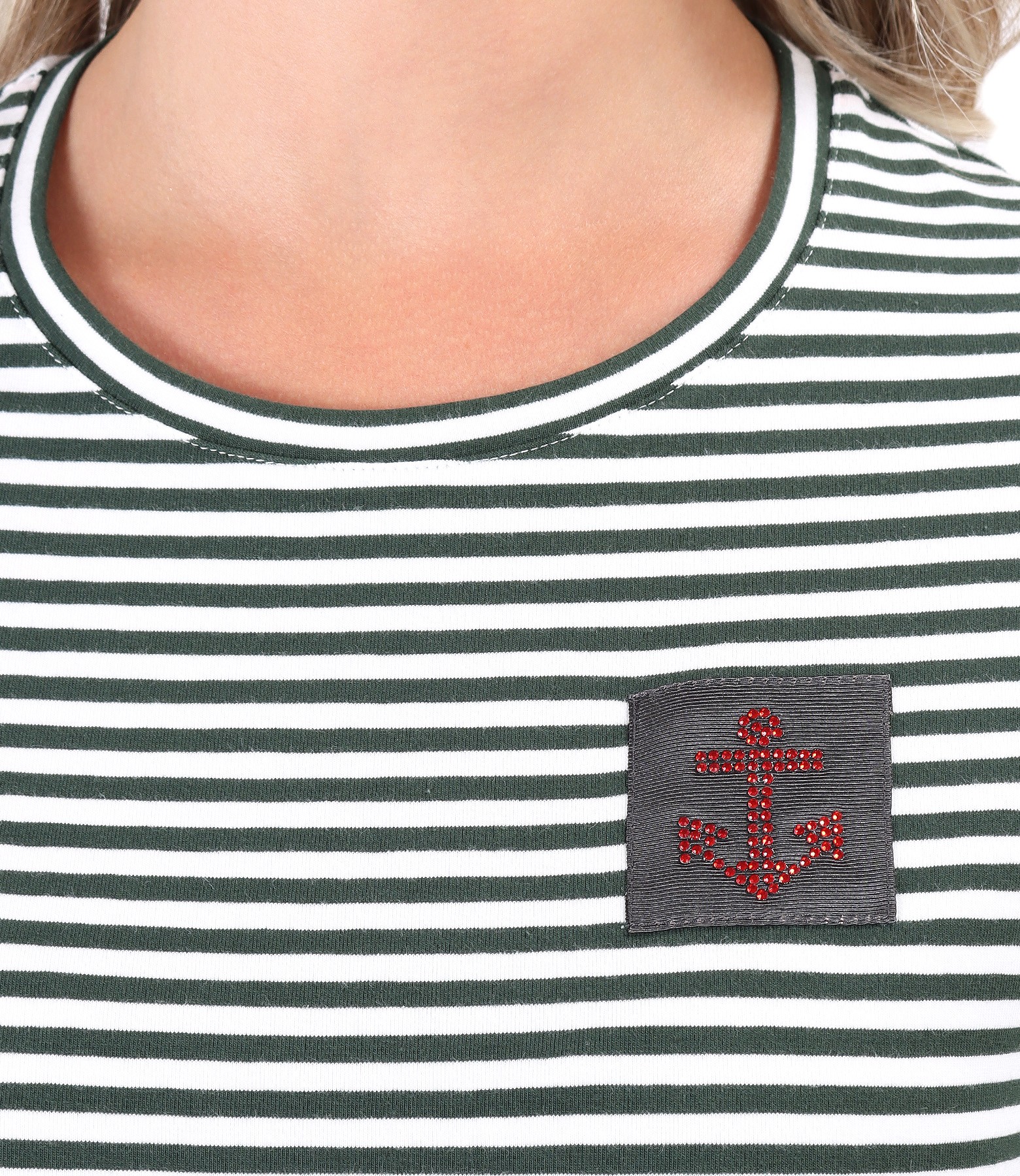 Rochie lunga din jerse elastic cu dungi, necaptusita, cu maneci scurte, decolteu rotund cu aplicatie decorativa in forma de ancora si cu slituri laterale. Nu are sistem de inchidere.