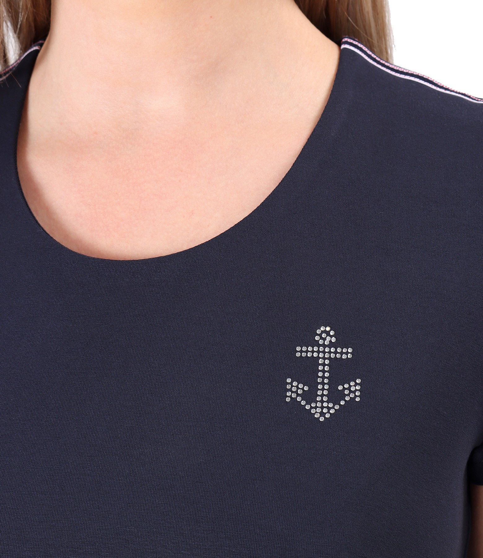 Rochie lunga din jerse elastic de viscoza, necaptusita, cu decolteu rotund, buzunare laterale, cu banda de rips pe umeri si cu aplicatie de cristale in forma de ancora pe piept. Are slit la spate si nu are sistem de inchidere.