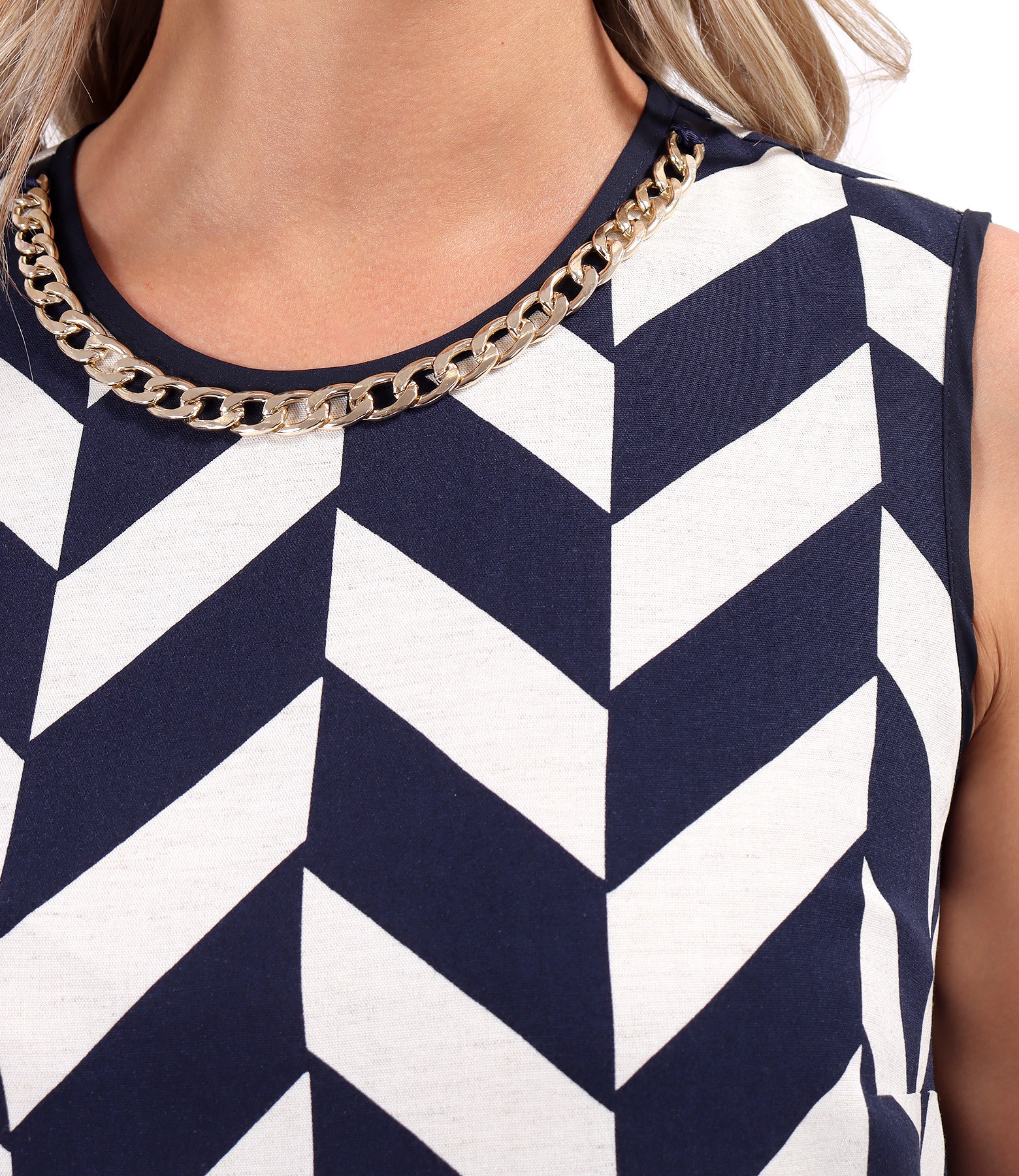 Rochie lunga din viscoza cu in imprimata cu dungi, cu slit pe lateral stanga cu canafi aurii la terminatie si decolteu rotund cu lant decorativ. Se inchide cu un nasture pe mijloc spate.