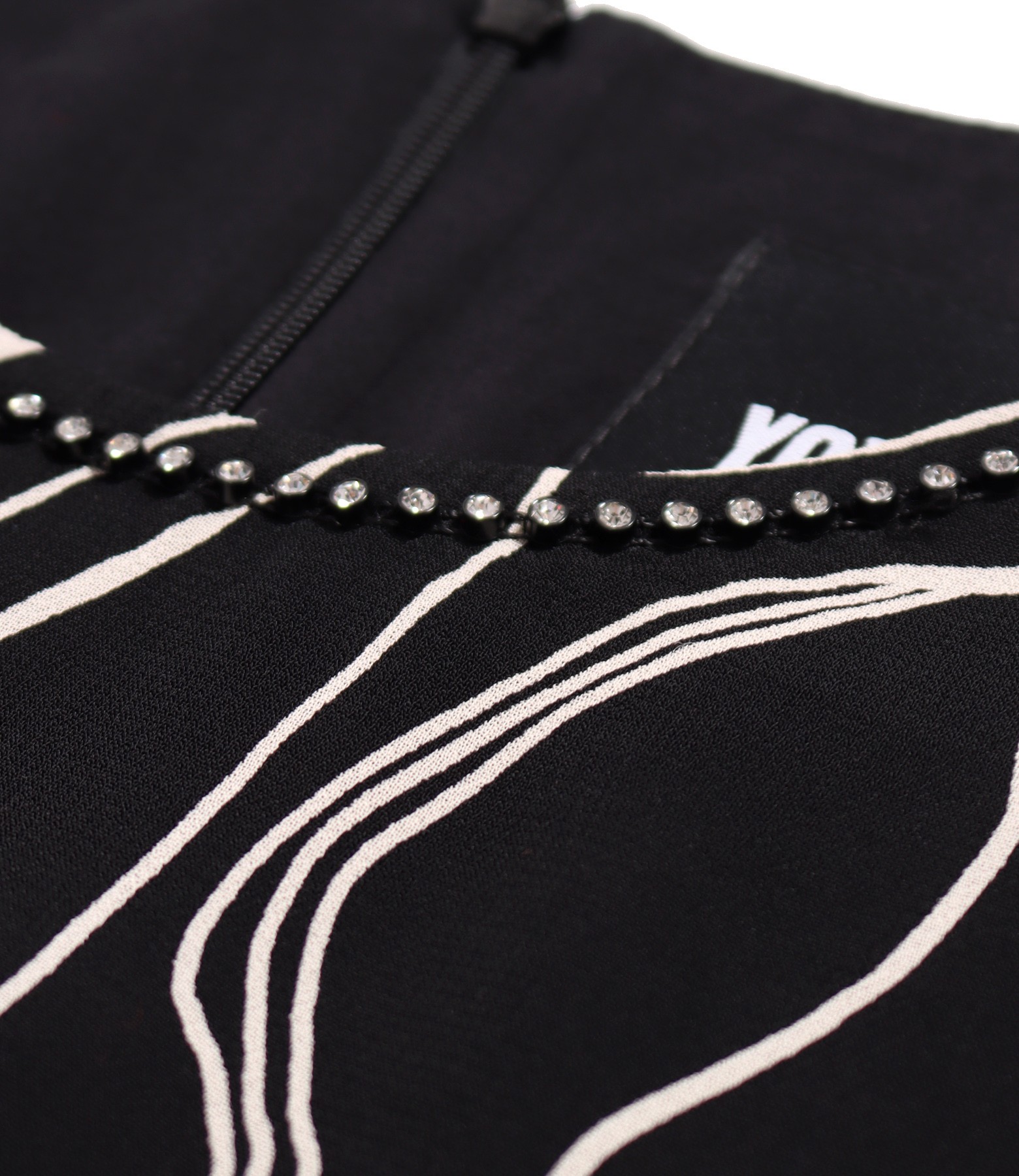 Rochie lunga din viscoza imprimata cu motive geometrice cu slituri laterale, si decolteu rotund cu cristale cusute manual. Rochia este dublata cu viscoza. Se inchide cu fermoar ascuns pe mijloc spate.