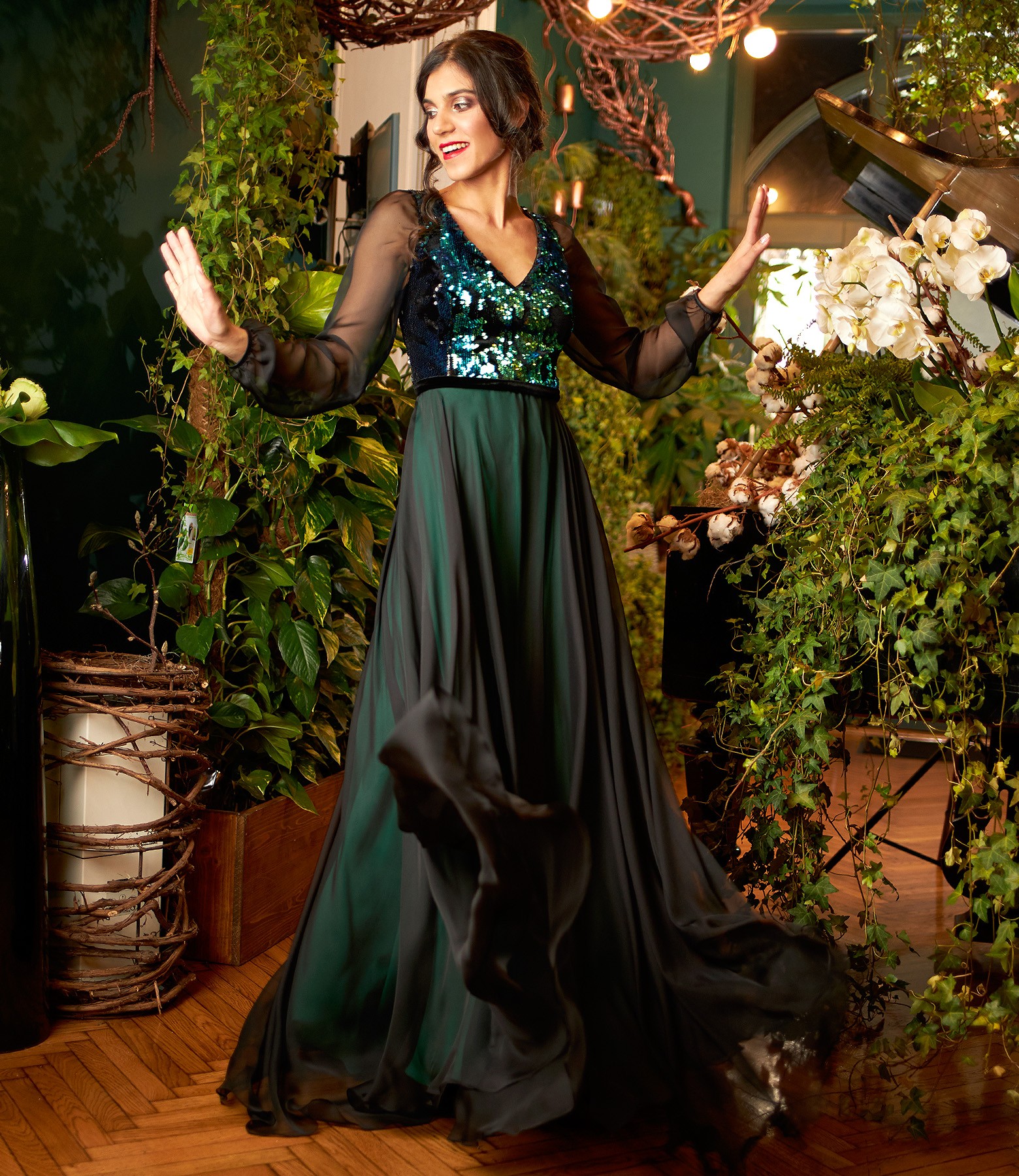Rochie lunga de seara din voal, cu corsaj din paiete brodate pe catifea, captusita cu saten elastic, cu maneci lungi din voal si decolteu adanc in V. Se inchide cu fermoar ascuns pe mijloc spate.