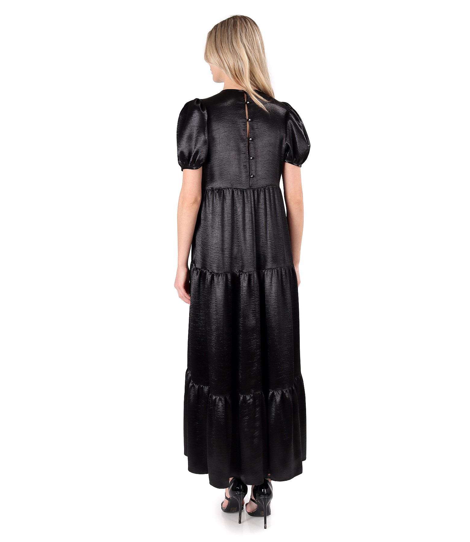 Rochie lunga satinata cu volane asimetrice, necaptusita, cu decolteu rotund si maneci scurte. Se inchide cu 6 nasturi pe mijloc spate.