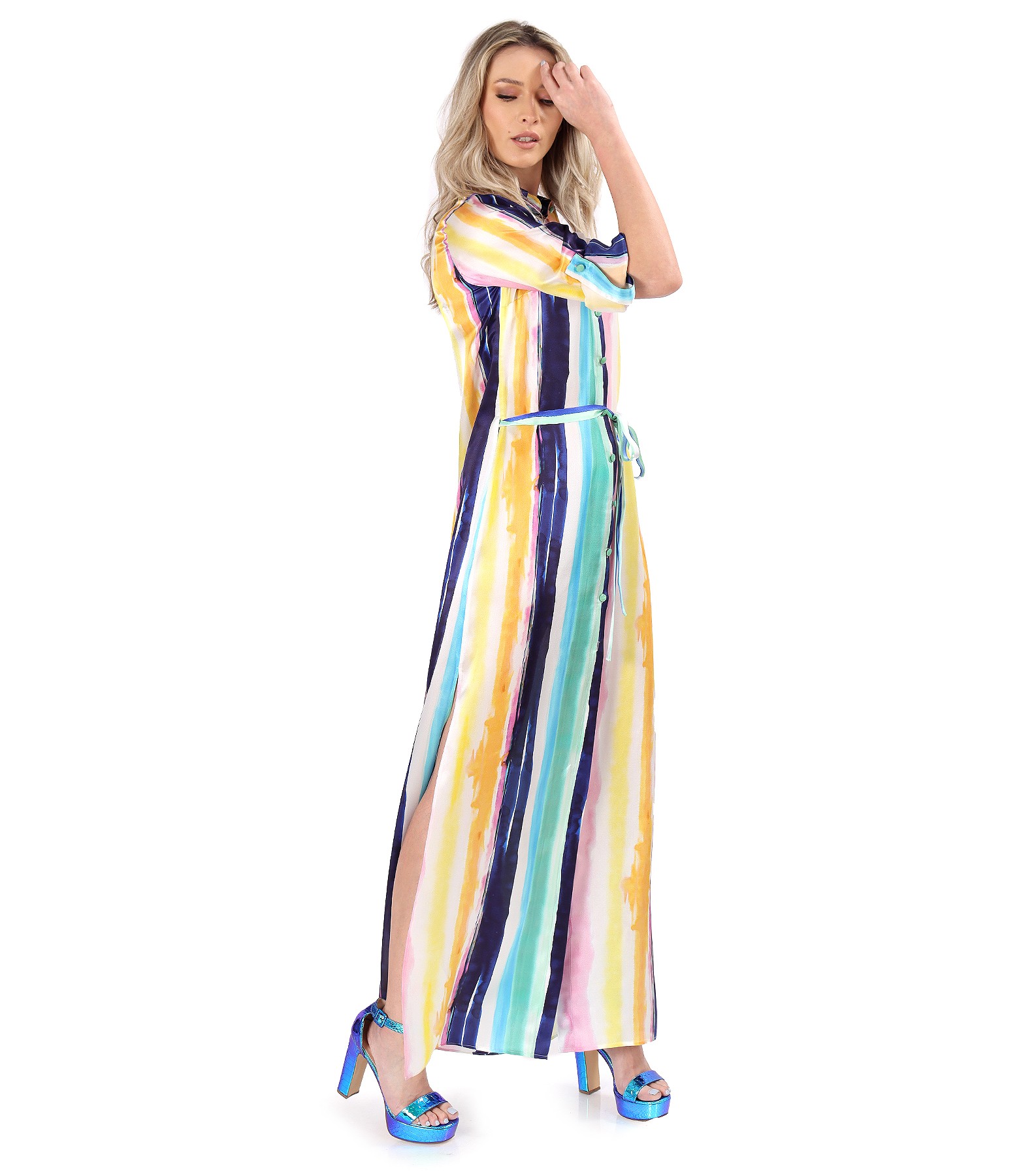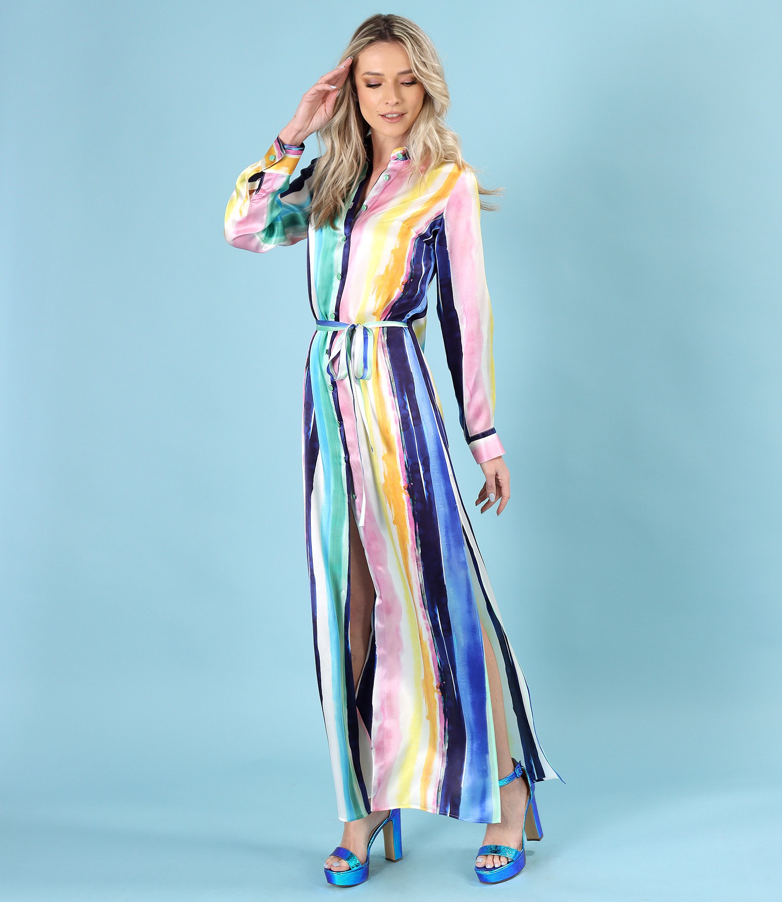 Rochie lunga tip camasa din matase naturala imprimata cu dungi, cu maneci lungi, cu slituri laterale si cu cordon in talie. Se inchide cu 11 nasturi pe mijloc fata. Pozitia imprimeului variaza per produs.