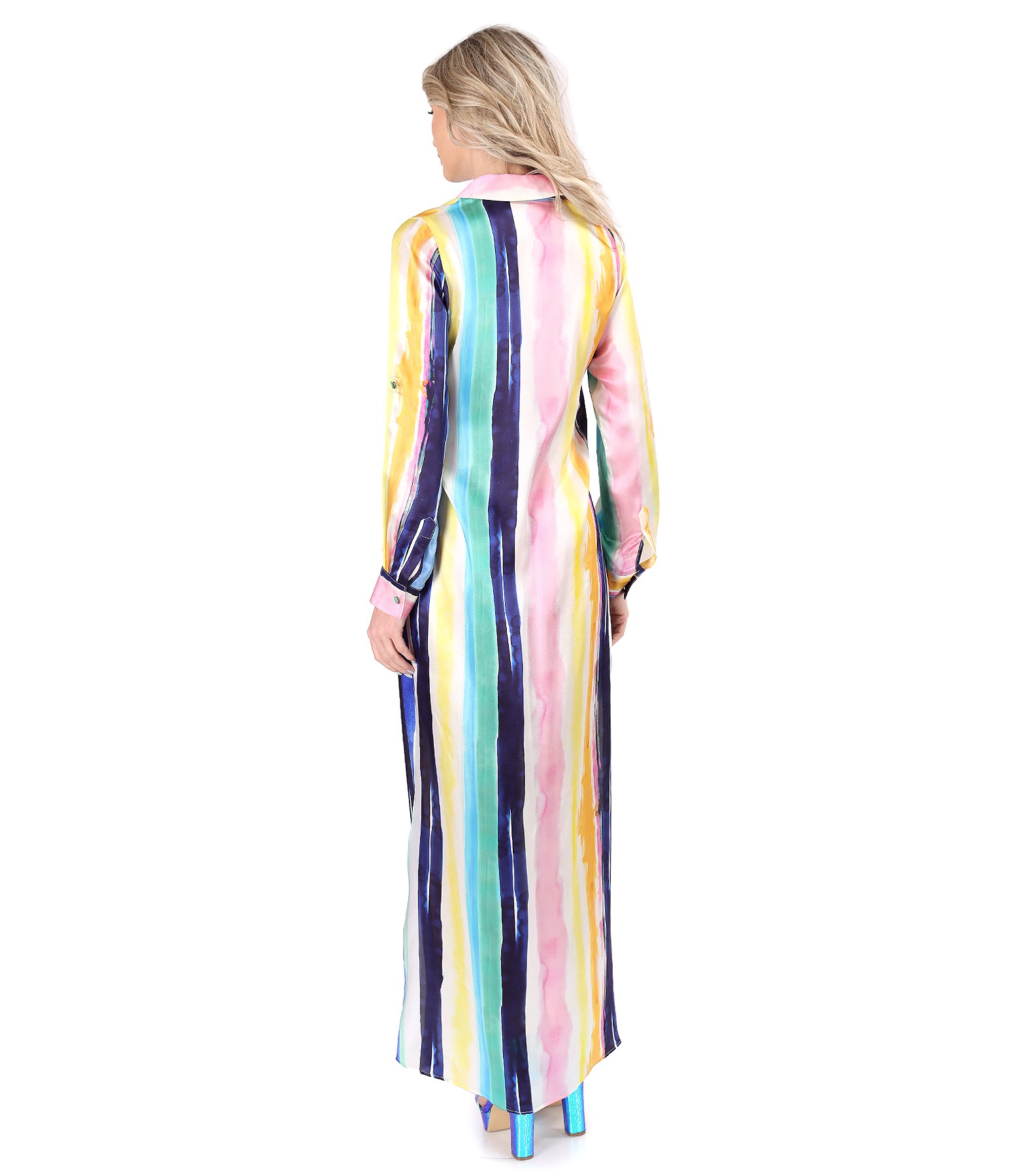 Rochie lunga tip camasa din matase naturala imprimata cu dungi