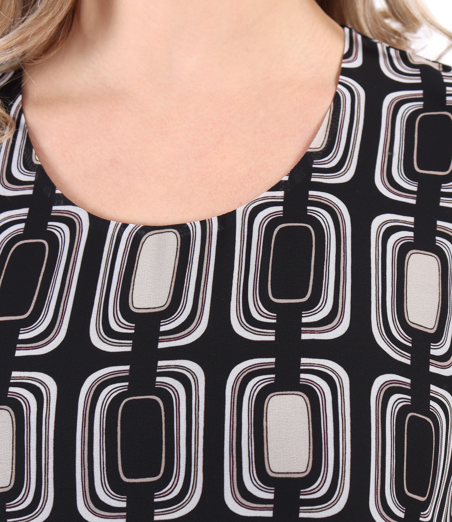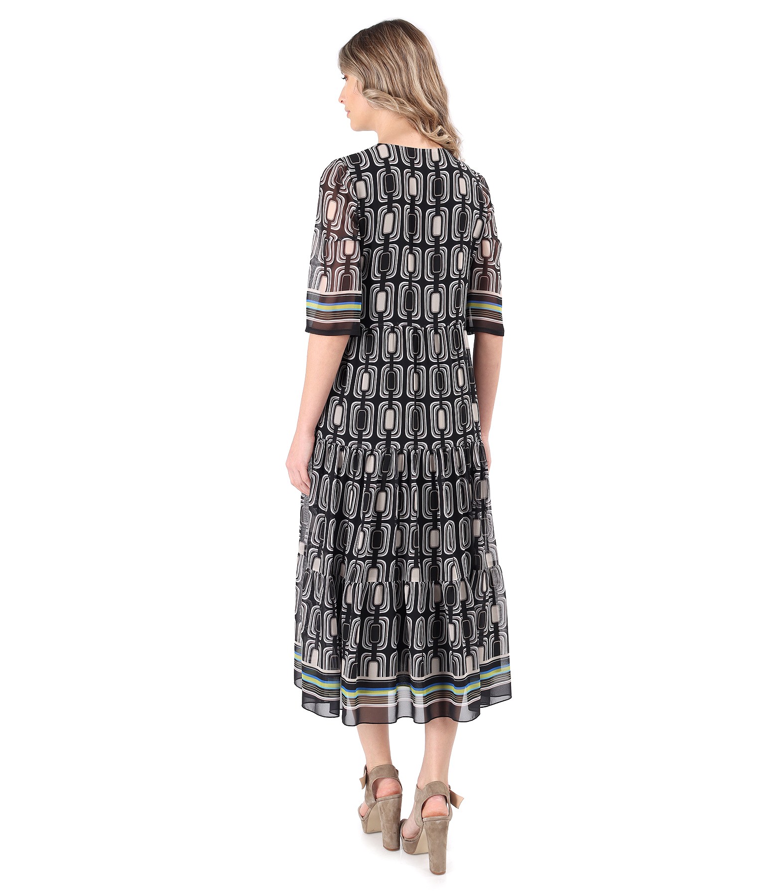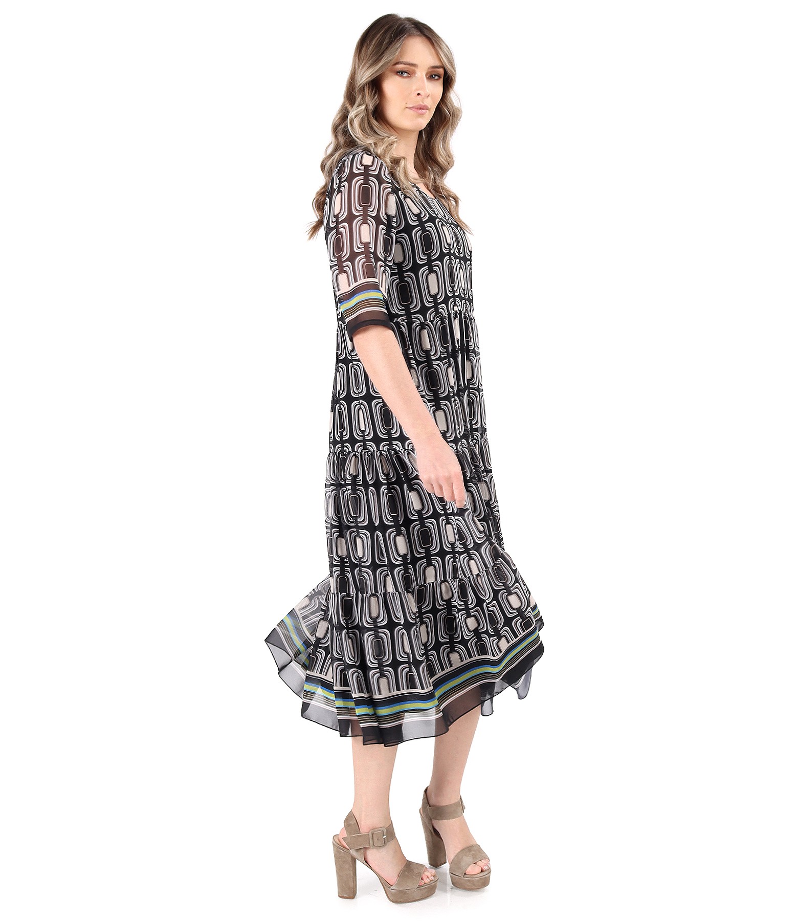 Rochie midi cu volane din voal imprimat digital cu motive geometrice, dublata cu viscoza, cu maneci 3/4 si decolteu rotund. Nu are sistem de inchidere.