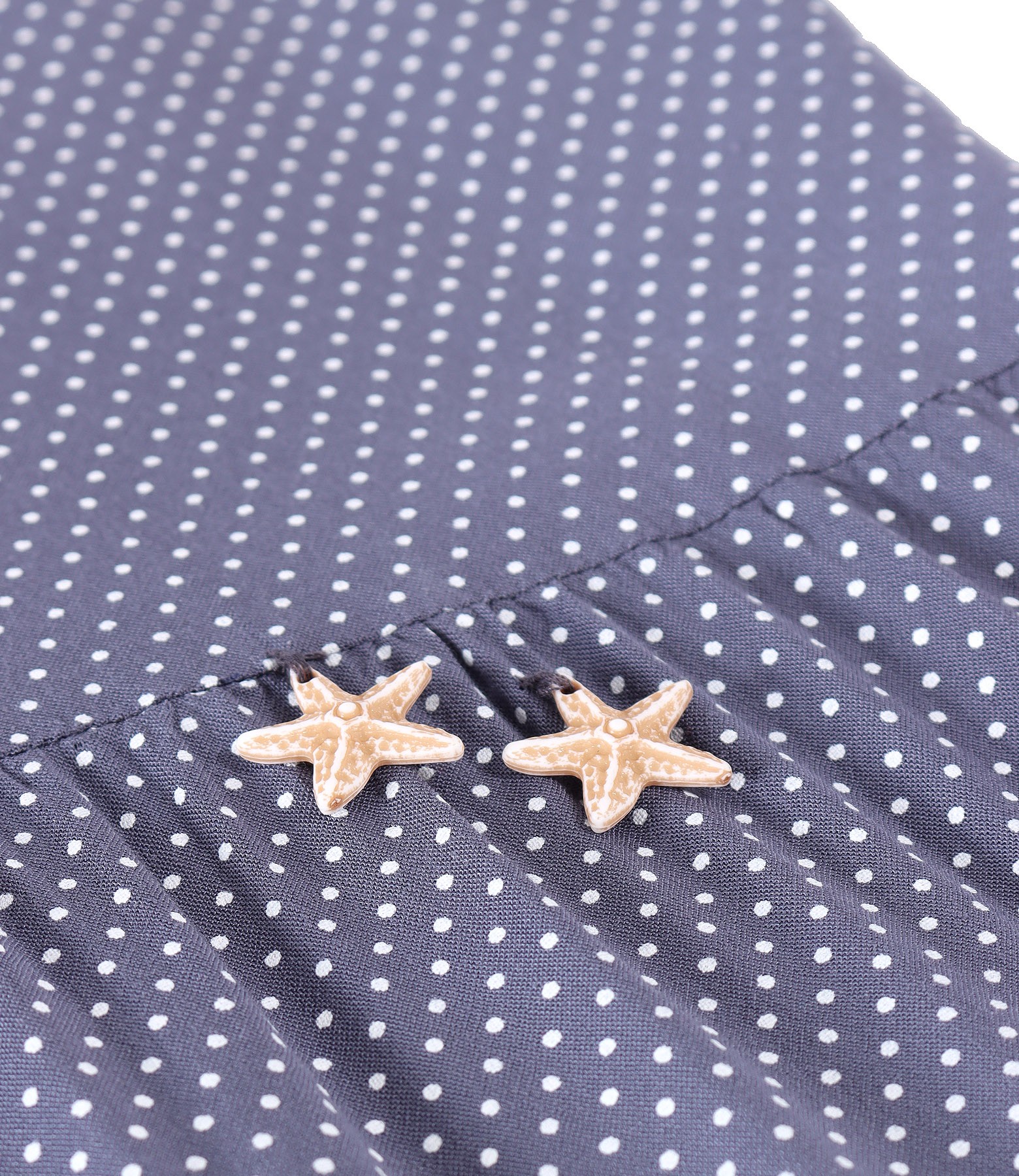 Rochie midi cu volan din viscoza imprimata cu picouri, necaptusita, fara maneci si cu guler rotund pe langa gat. Se inchide cu un nasture pe mijloc spate.