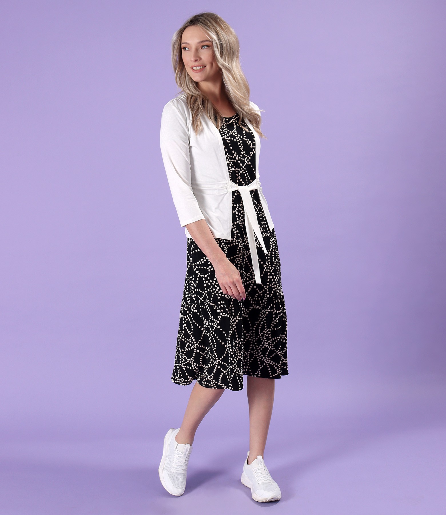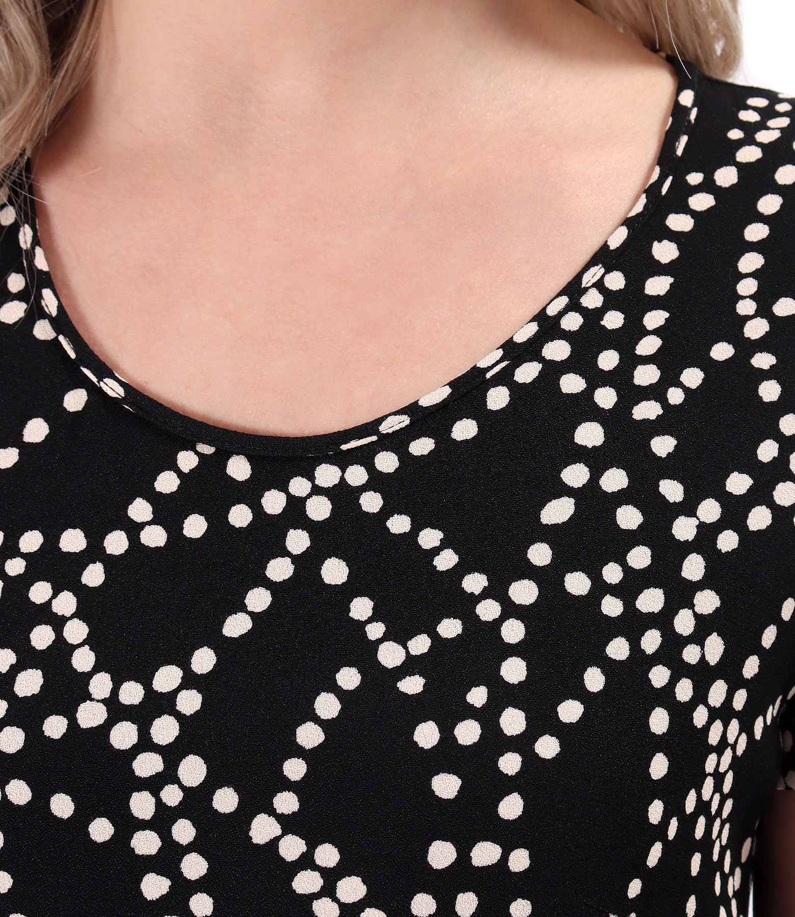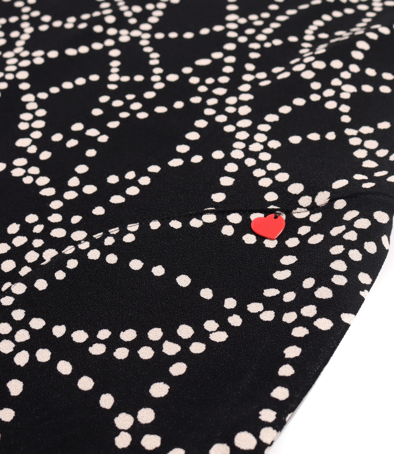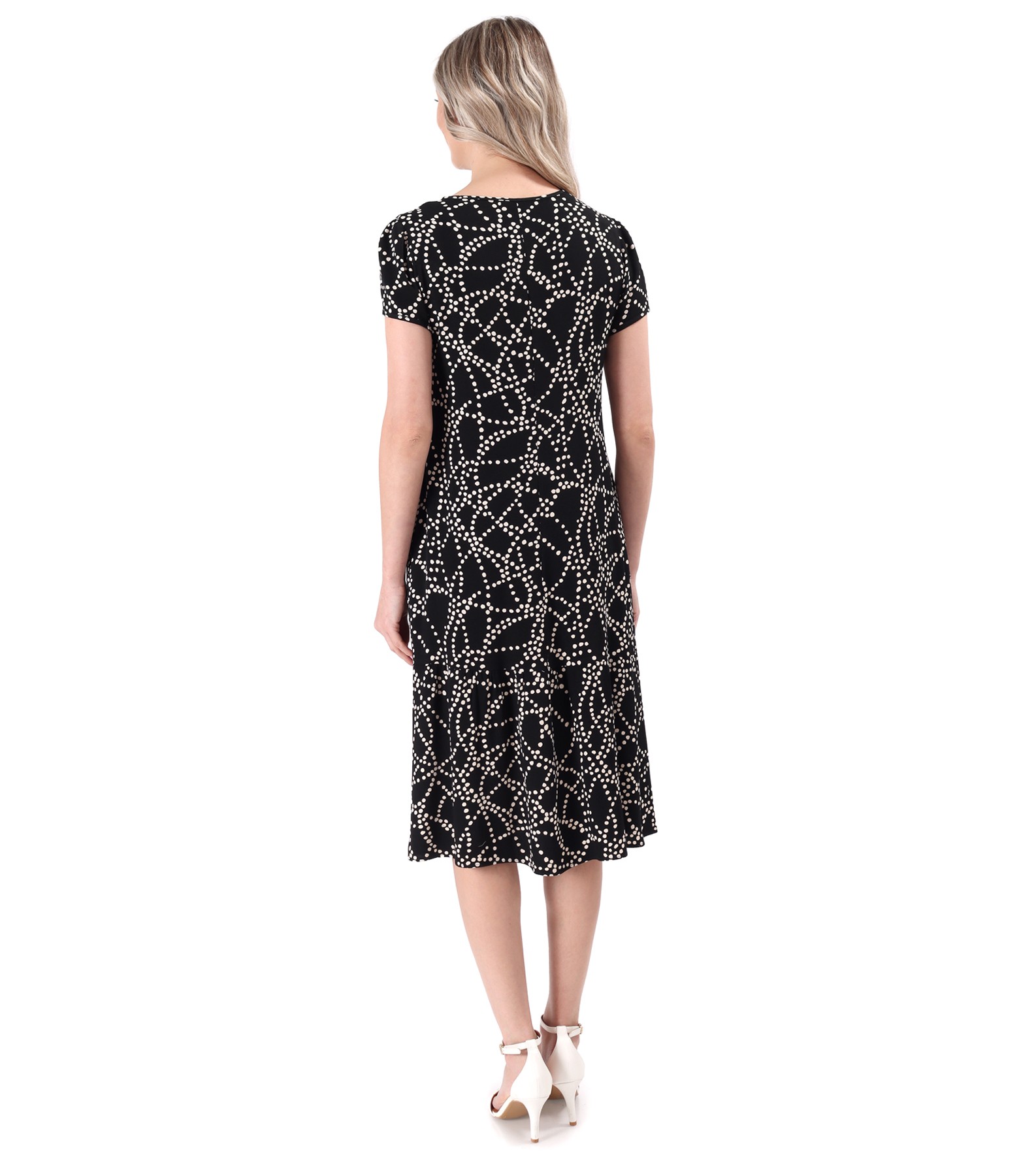 Rochie midi cu volan din viscoza imprimata cu motive geometrice, necaptusita, maneci scurte, decolteu rotund, buzunare laterale aplicate si inima metalica decorativa la buzunar stanga.