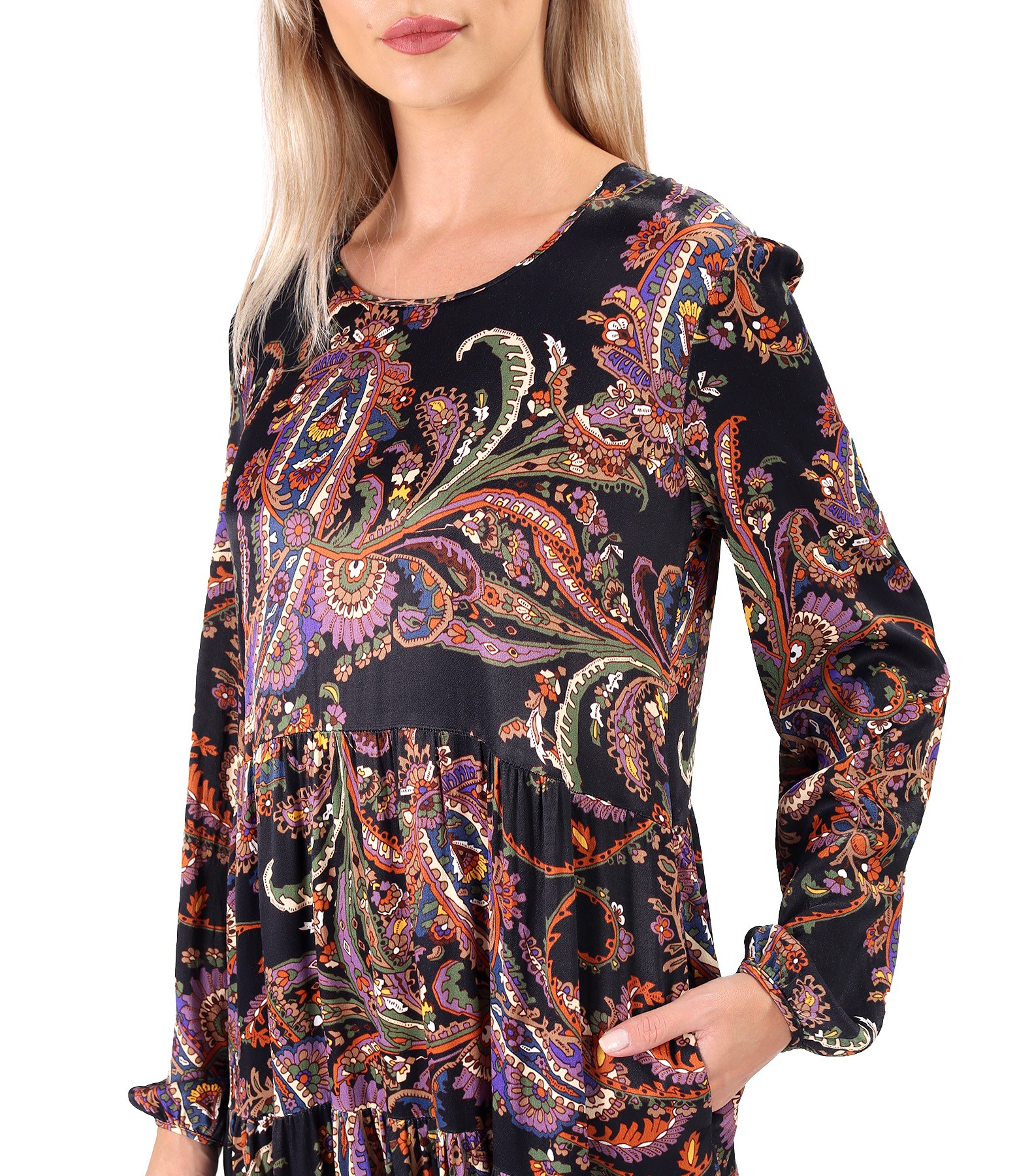 Rochie midi cu volane din saten de viscoza imprimata digital cu motive paisley, decolteu rotund si maneci lungi incretite la terminatie. Se inchide cu un nasture pe mijloc spate.
