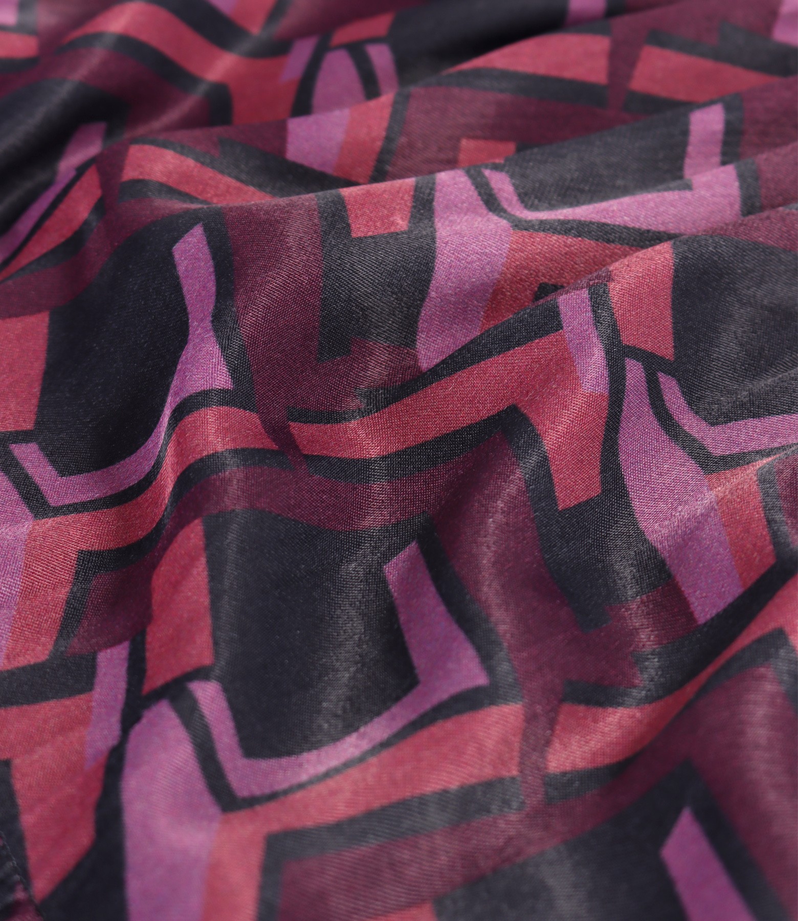Rochie midi cu volane din saten de viscoza imprimata digital cu motive geometrice, decolteu rotund si maneci lungi incretite la terminatie. Se inchide cu un nasture pe mijloc spate.